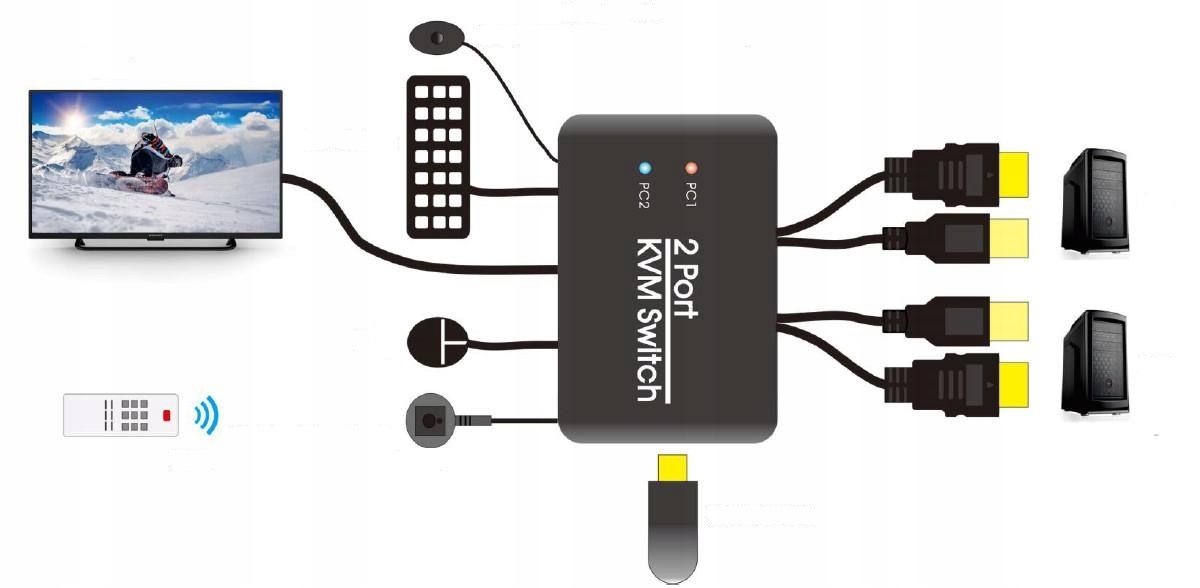 KVM USB-перемикач може керувати двома комп’ютерами за допомогою одного набору миші, клавіатури та виводити зображення на один дисплей (монітор, телевізор)