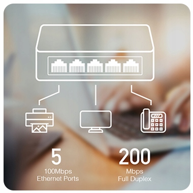 Компутатор підключає до 5 пристроїв на швидкості до 100 Мбіт/с (напівдуплекс)/200 Мбіт/с (повний дуплекс). Він забезпечує надзвичайно плавну роботу в потужній, безперебійній, доступній і зручній у використанні мережі, ідеально підходить для мультимедіа, графіки, HD-відео та інших додатків, які потребують великої пропускної здатності.