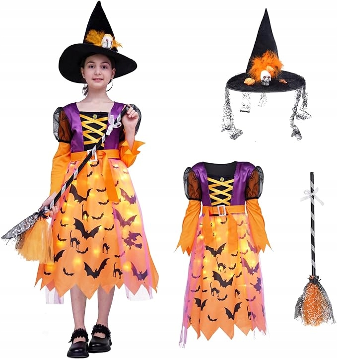 - 【Набір костюмів відьми з казки】- Набір костюмів відьми включає повну спідницю зі світлодіодним освітленням, палицю відьомської мітли та капелюх відьми. < /ul>