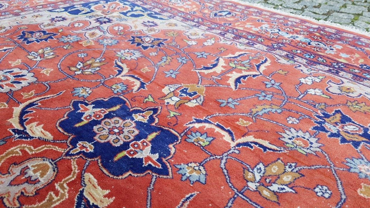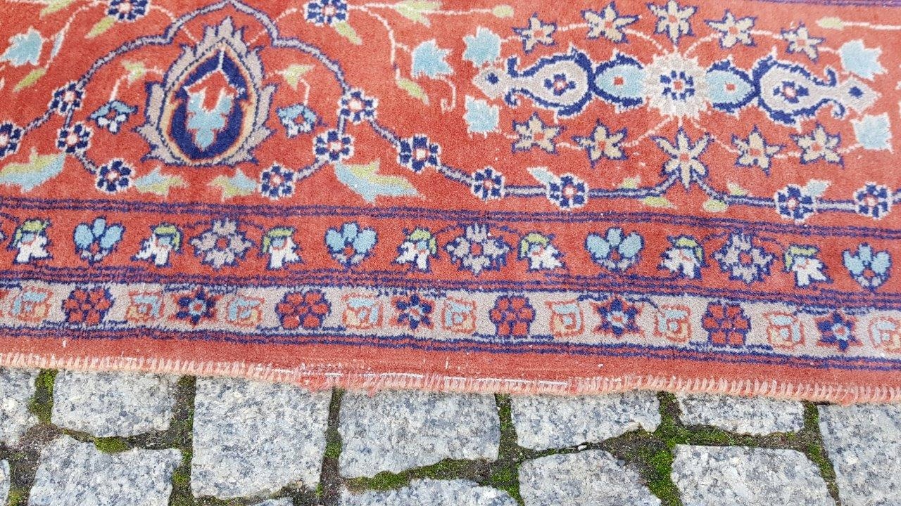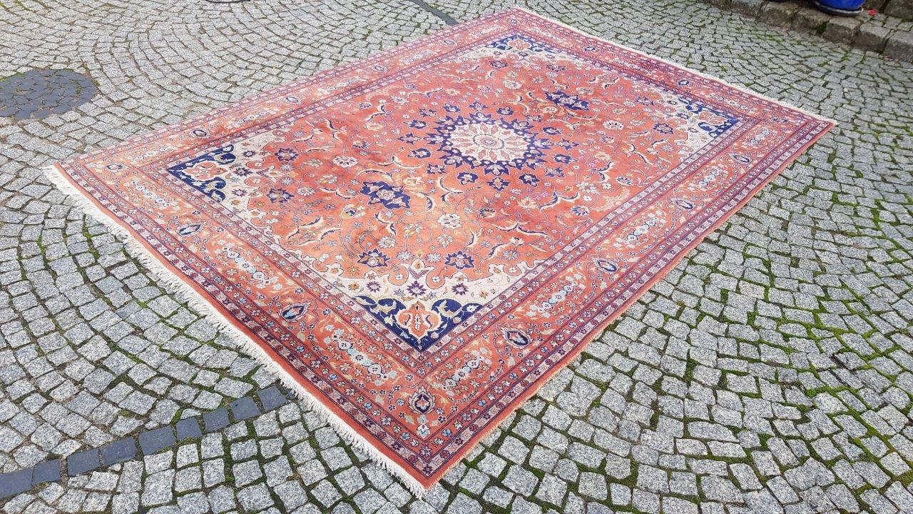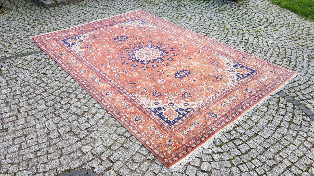 Прекрасний індійський килим Ісфахан. Виткана вручну з вовни найвищої якості. Характеризується компактним, приємним на дотик, блискучим флісом і красивими кольорами та візерунками. Зберігся в хорошому стані. Має дефекти на краю.