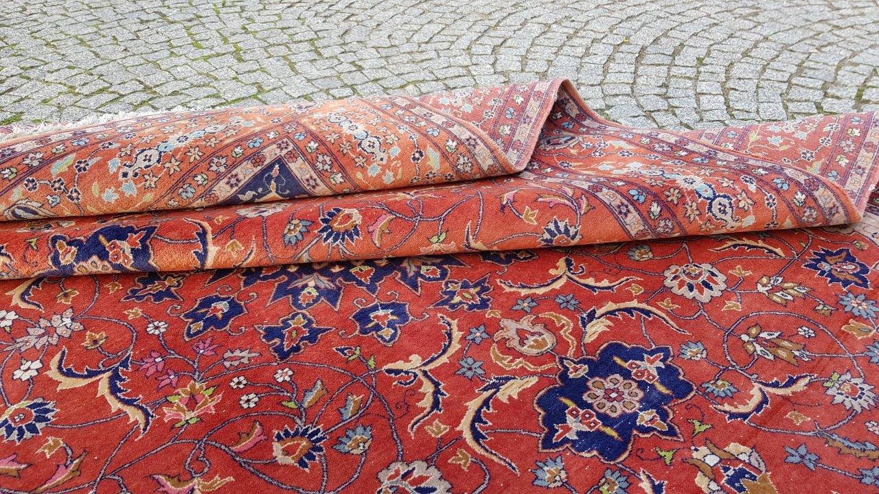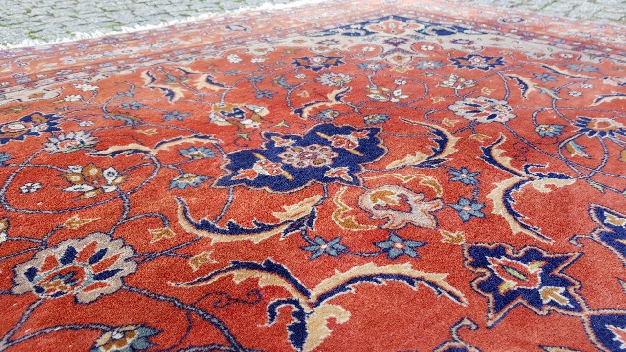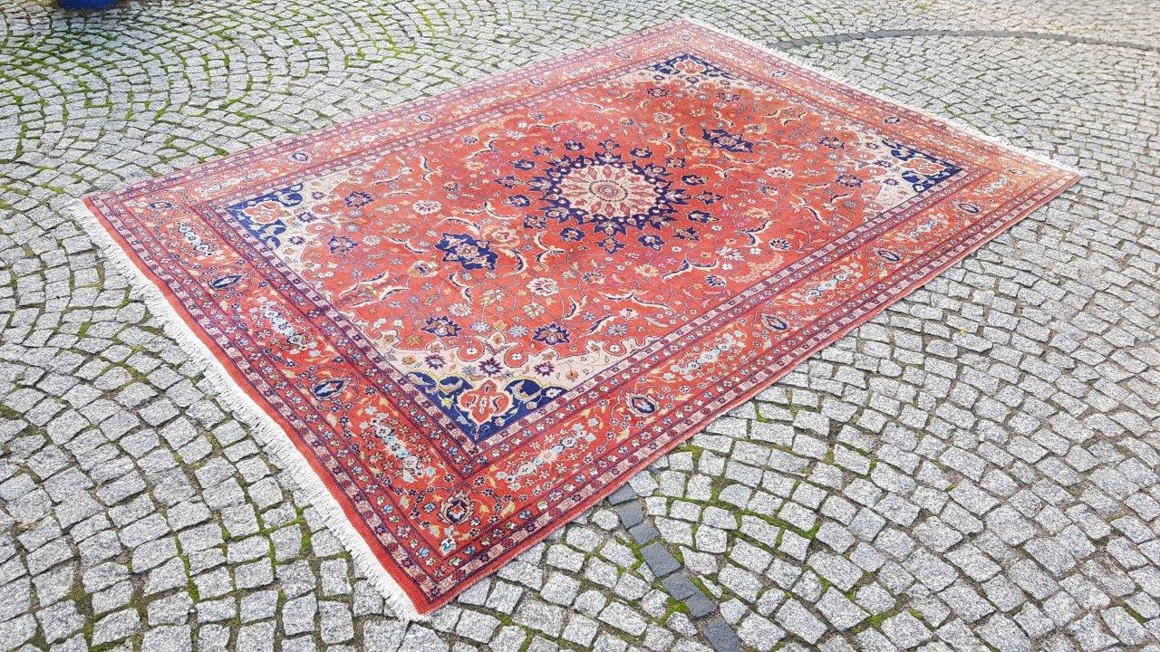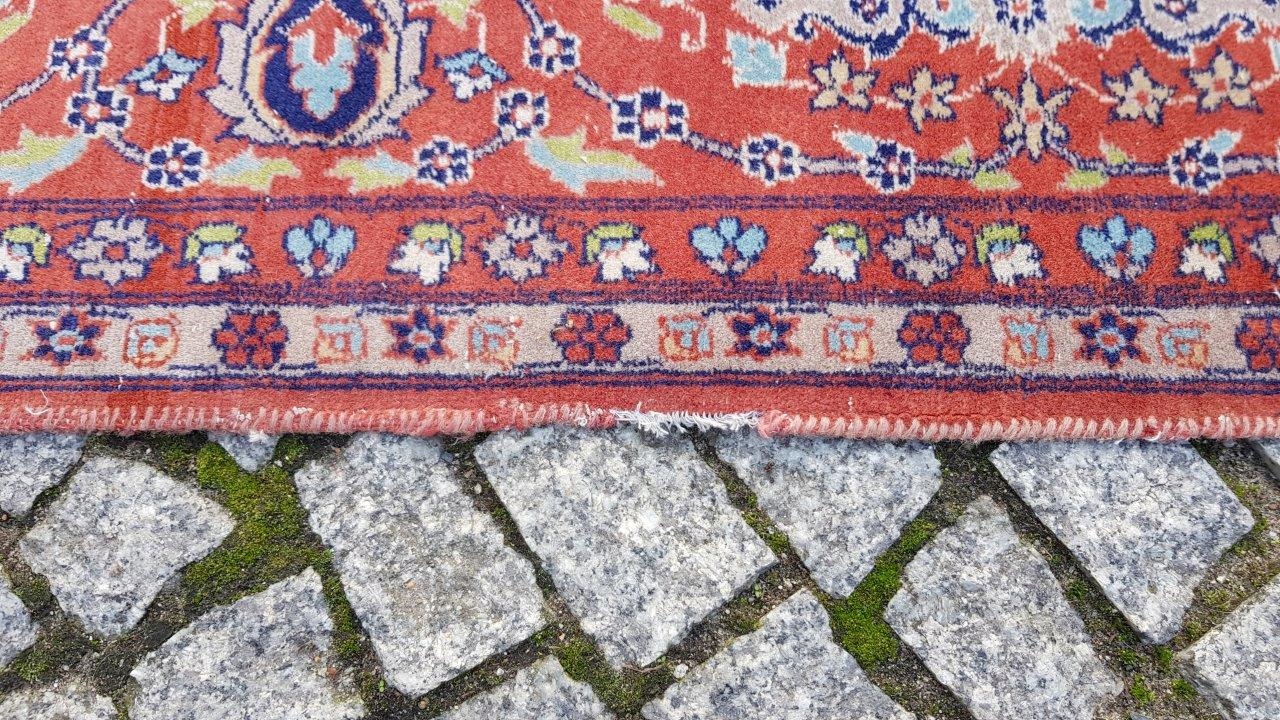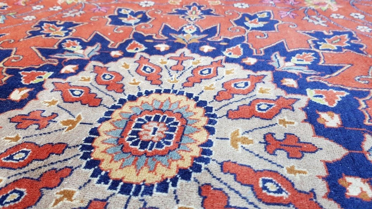 Прекрасний індійський килим Ісфахан. Виткана вручну з вовни найвищої якості. Характеризується компактним, приємним на дотик, блискучим флісом і красивими кольорами та візерунками. Зберігся в хорошому стані. Має дефекти на краю.