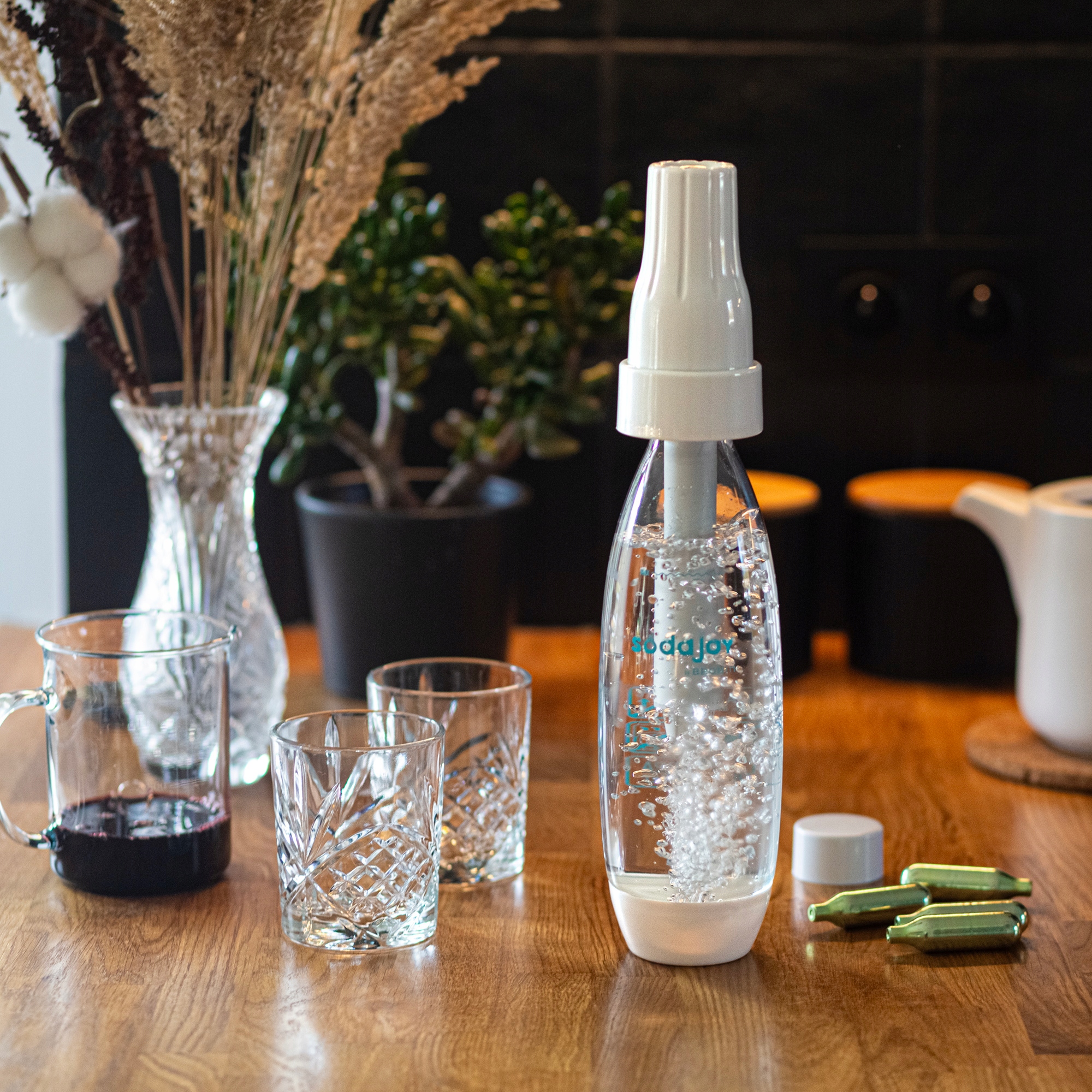 - Безпечно для здоров'я - якість підтверджена тестами - пристрій повністю виготовлено з матеріалів без BPA, призначених для контакту з їжею. Карбонатор SodaJoy також можна використовувати для газування алкогольних напоїв максимальною міцністю 40%.