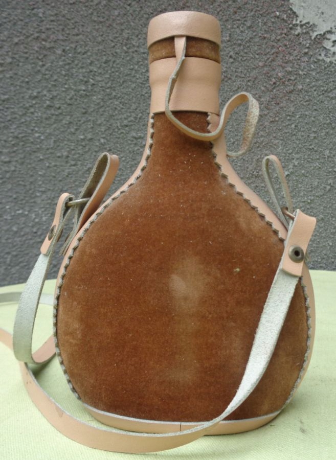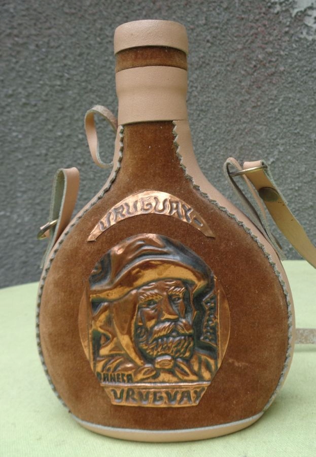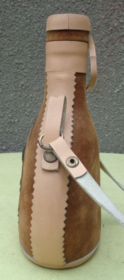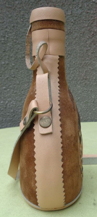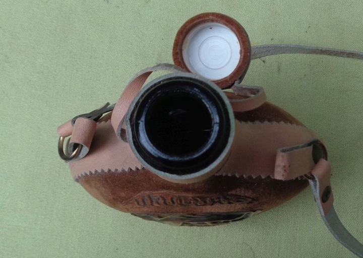 Цікава, цікава пляшка для алкоголю з темно-зеленого скла в тканинному футлярі. Флакон знаходиться в тканинному футлярі з плюшевого коричневого матеріалу. З боків і знизу циліндра є вставки зі світлої штучної шкіри. Зверху циліндр також обтягнутий штучною шкірою. Кришка циліндра також закріплена штучною шкірою. У центральній частині розміщено емблему з латунного листа із зображенням людини з бородою та назвою алкоголю. Зверху також є латунна вставка з ім'ям. Ручка виконана зі штучної шкіри. Рекомендую всім.