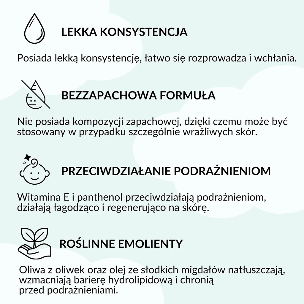 Шкіра дитини дуже ніжна і потребує особливого догляду. Для забезпечення максимальної безпеки крем не містить ароматизаторів, що робить його придатним для догляду навіть за найчутливішою шкірою.