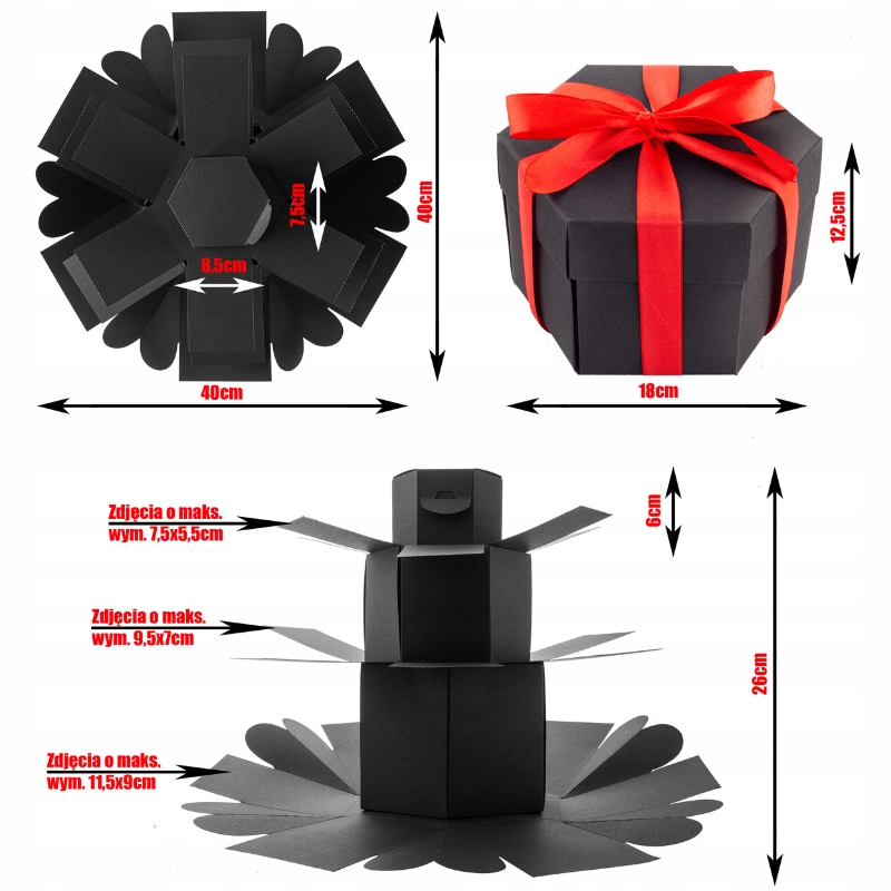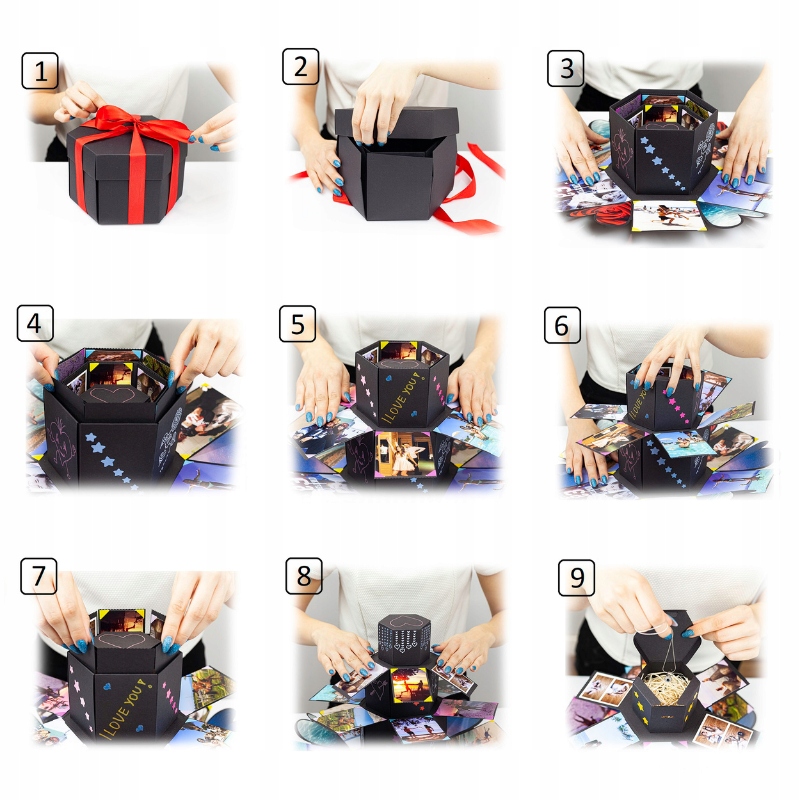 Для декорування не потрібно нічого купувати – усе входить у комплект. Просто роздрукуйте свої фотографії, виріжте їх у відповідний формат і вставте в коробку. Створіть власну коробку та здивуйте надзвичайним подарунком!