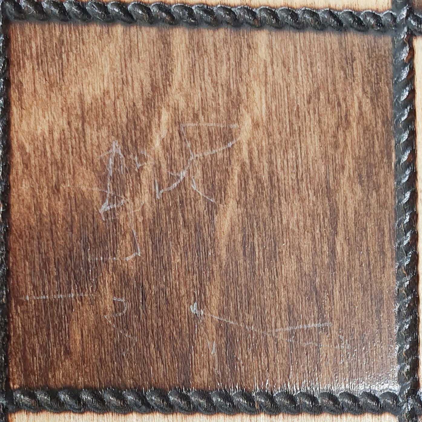 Шахівниця з липи, фарбована та лакована, застібка під золото. Центр обшитий зеленою вставкою.