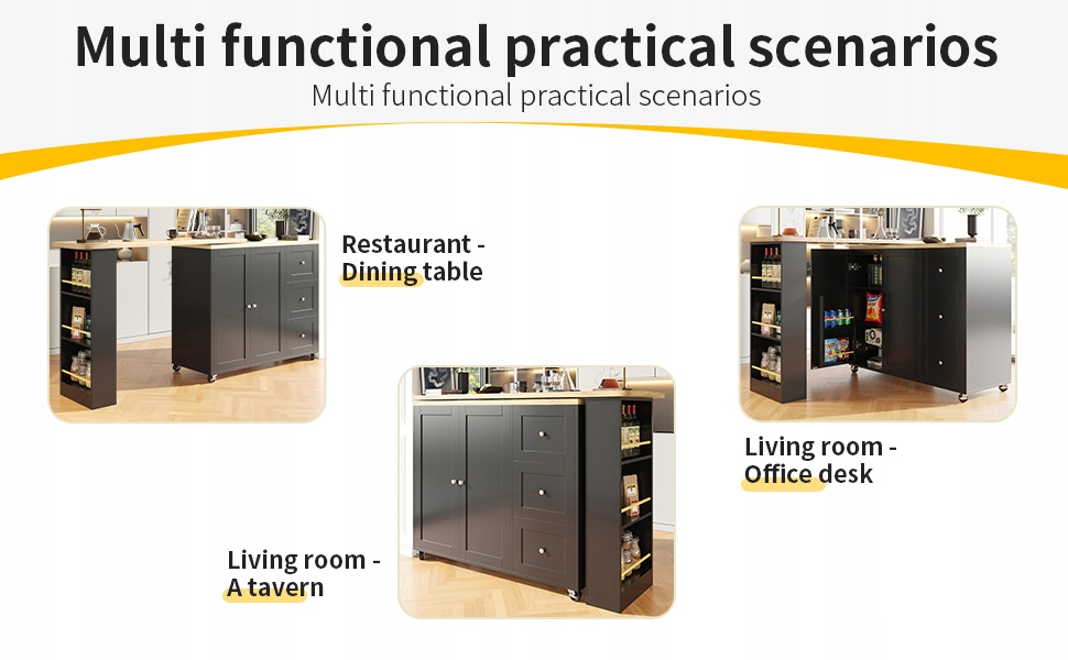 Барний стіл, що обертається на 360° (138-209 x 39 x 104 см) на колесах, чорний, з трьома висувними ящиками. Тримач для закусок в комплекті. Багатофункціональний острів для зберігання, підходить для кухні та вітальні