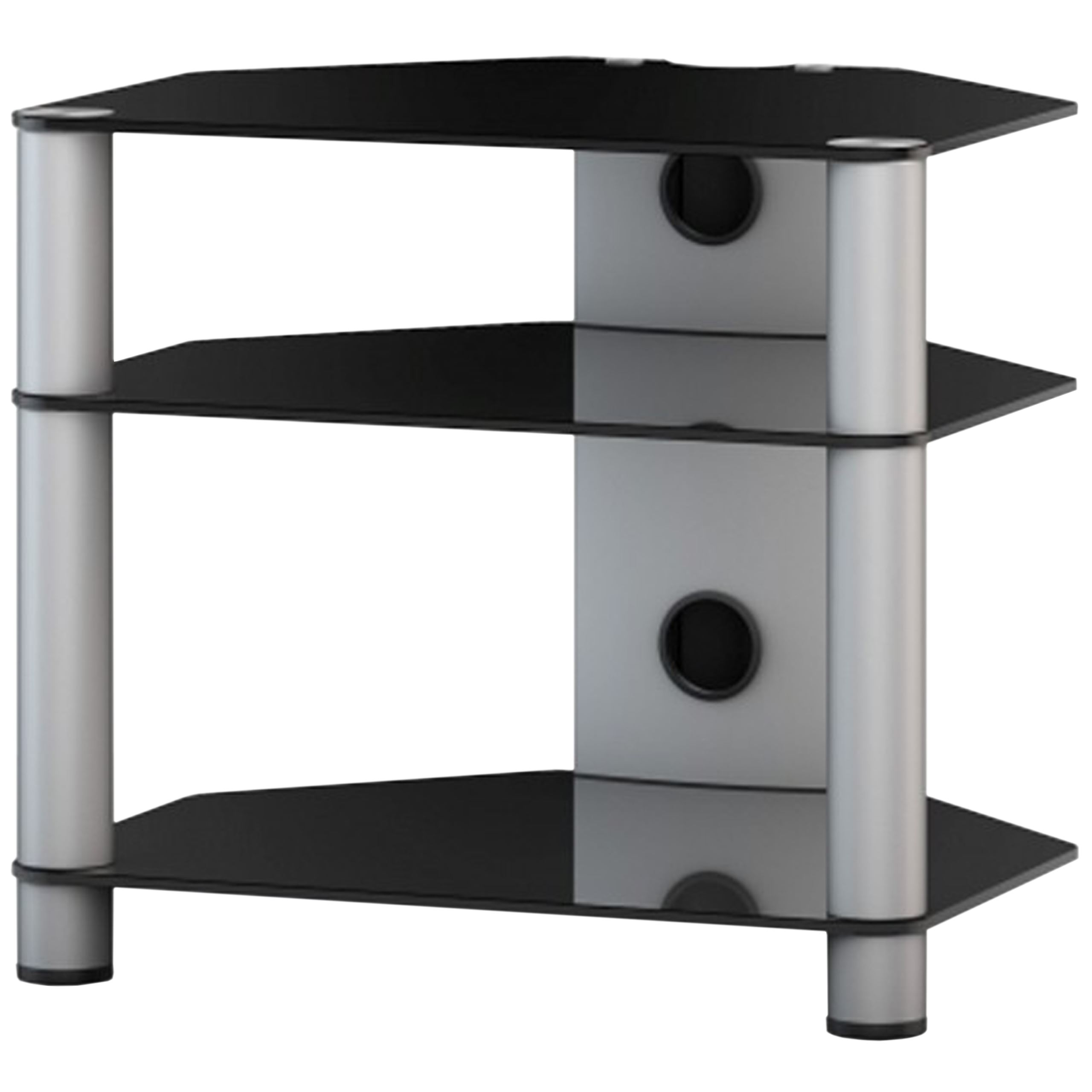 Ідеально підходить для будь-якого інтер'єру алюмінієвий TV стіл зі скляними полицями для аудіо-відео обладнання. Стільниця з полицями виготовлена з плоского загартованого скла з полірованими краями, що має дуже високу міцність.
