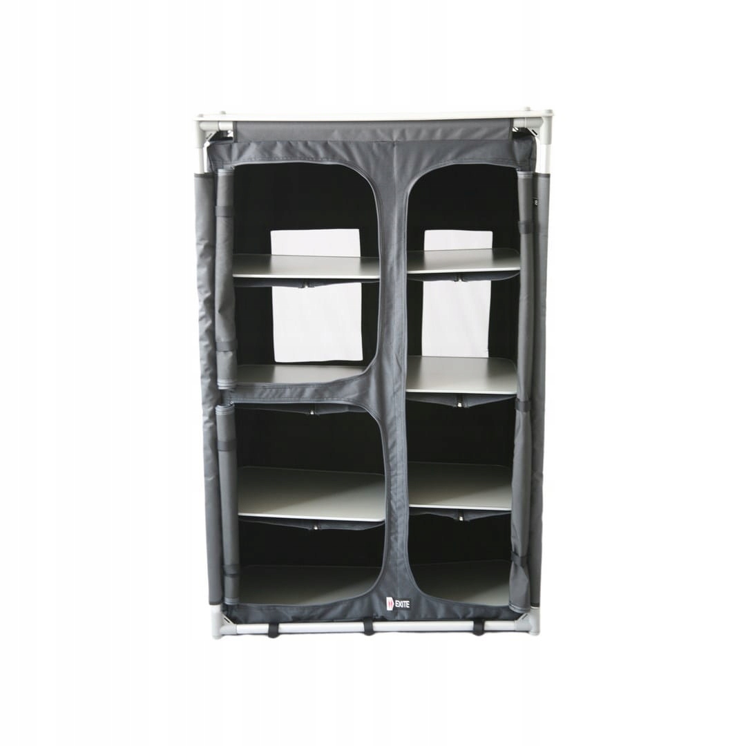 Кемпінгова складна двомісна шафа для намету. Виготовлений з матеріалів найвищої якості. Завдяки використанню новітніх дизайнерських рішень розкладання шафи відбувається швидко та зручно. Використання трубчастих профілів діаметром 25 мм зміцнює конструкцію шафи, що забезпечує високу стійкість до навантажень. Шафа має чотири полиці зліва і справа, з них три середні роз'ємні і можна зробити одну велику шафу з трубками для вішалок, на задній стінці є вентиляція, а зліва і справа є кишені . Кожна ніжка має регулювання рівня. Стільниця стійка до вологи та високої температури.
