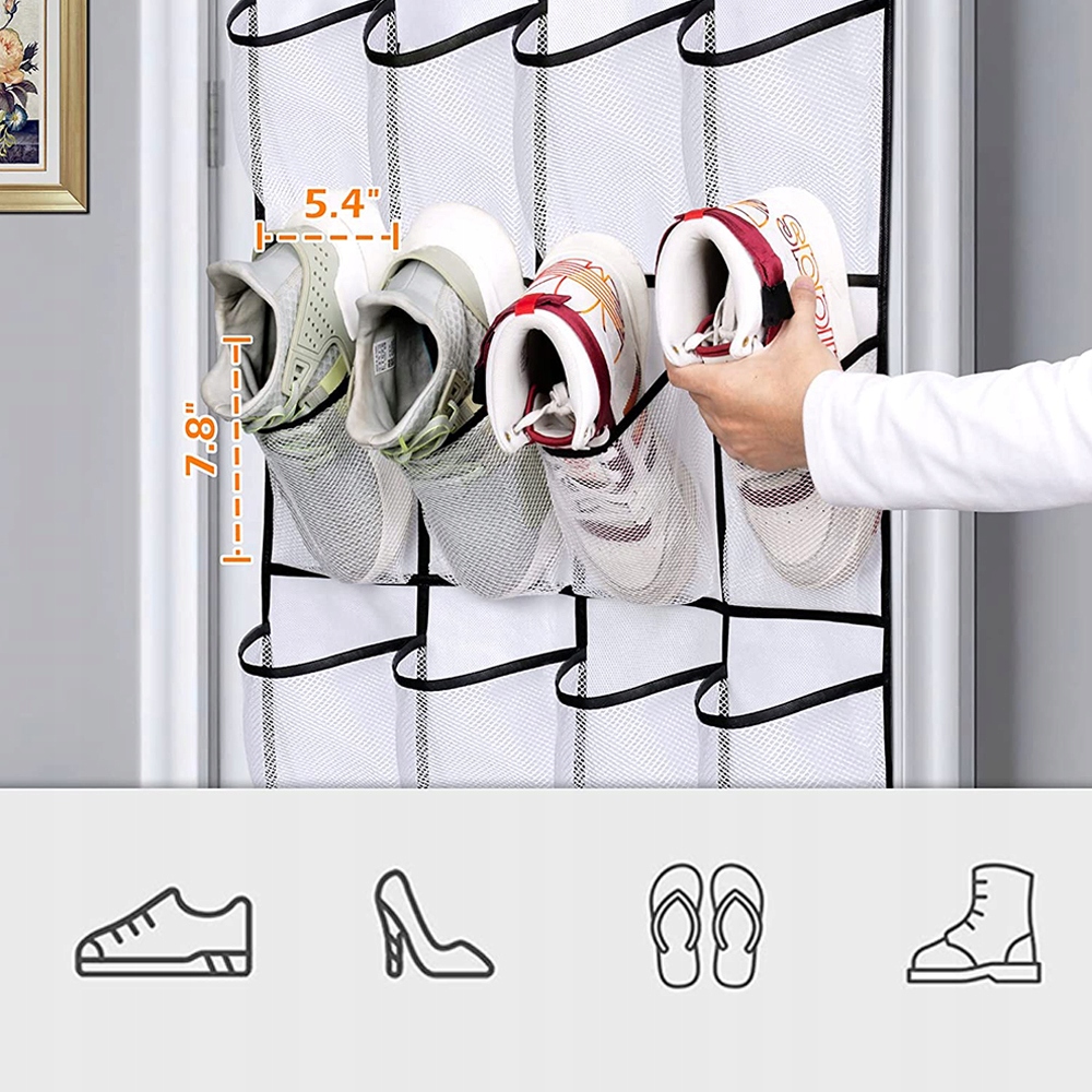 - ✨ - 【24 просторі кишені】: Органайзер для взуття пропонує 24 кишені для 12 пар взуття. Розмір для підвішування 150 x 56 см, кожна кишеня має розміри 23 x 13 x 12 см.