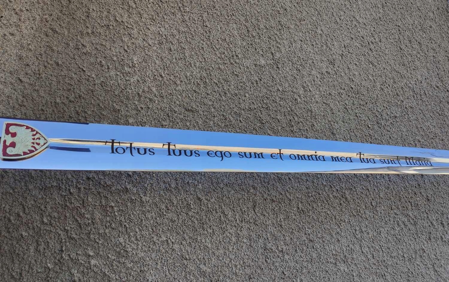 на мечі, виготовленому за допомогою лазерної техніки рук або логотипу + напис "Totus tuus mary". Клієнти також вирішують взяти більш тривалий напис без гербів: "Totus Tuus Ego Sum et Omnia Mea Tua Sunt Maria" (остання фотографія). Розміри меча