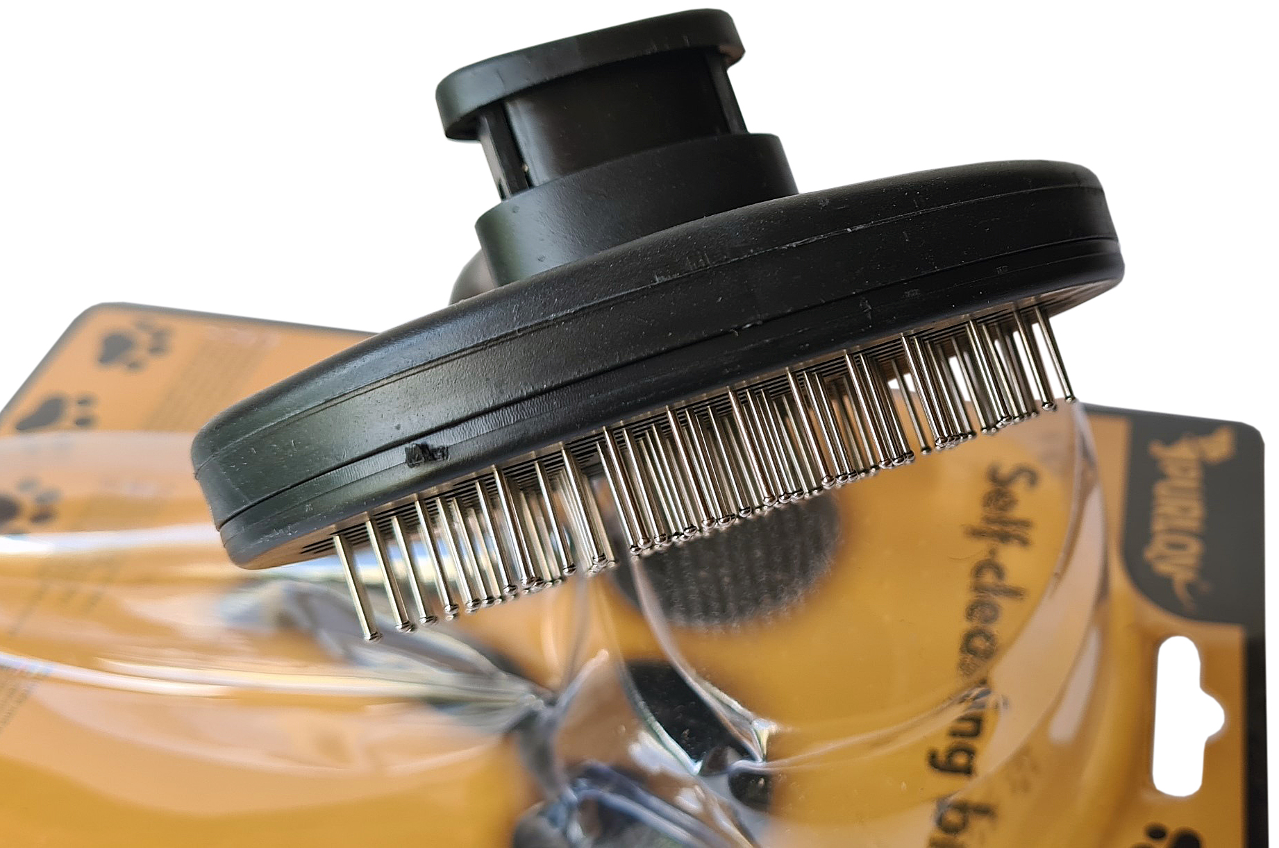 - САМООЧИЩЕННЯ - щітка самоочищується, завдяки зручній кнопці ефективно та швидко видаляє волосся, що застрягли на голках. Це дуже зручне рішення при розчісуванні тварини, адже під час розчісування не потрібно висмикувати шерсть, просто скористайтеся зручною кнопкою, і шерсть зійде сама.