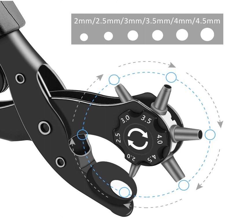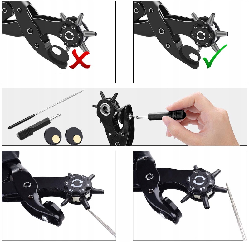 Наші плоскогубці дозволяють створювати отвори діаметром від 2 мм до 4,5 мм. Незалежно від того, чи працюєте ви з тканиною, шкірою чи ремінцями, наш дирокол пропонує різні розміри отворів, які завжди відповідатимуть вашим очікуванням.