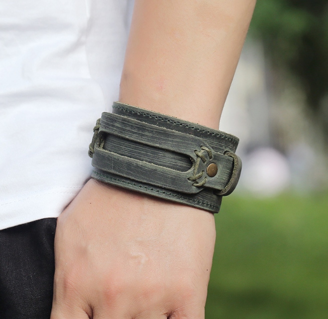 Широкий ретро-синій шкіряний браслет