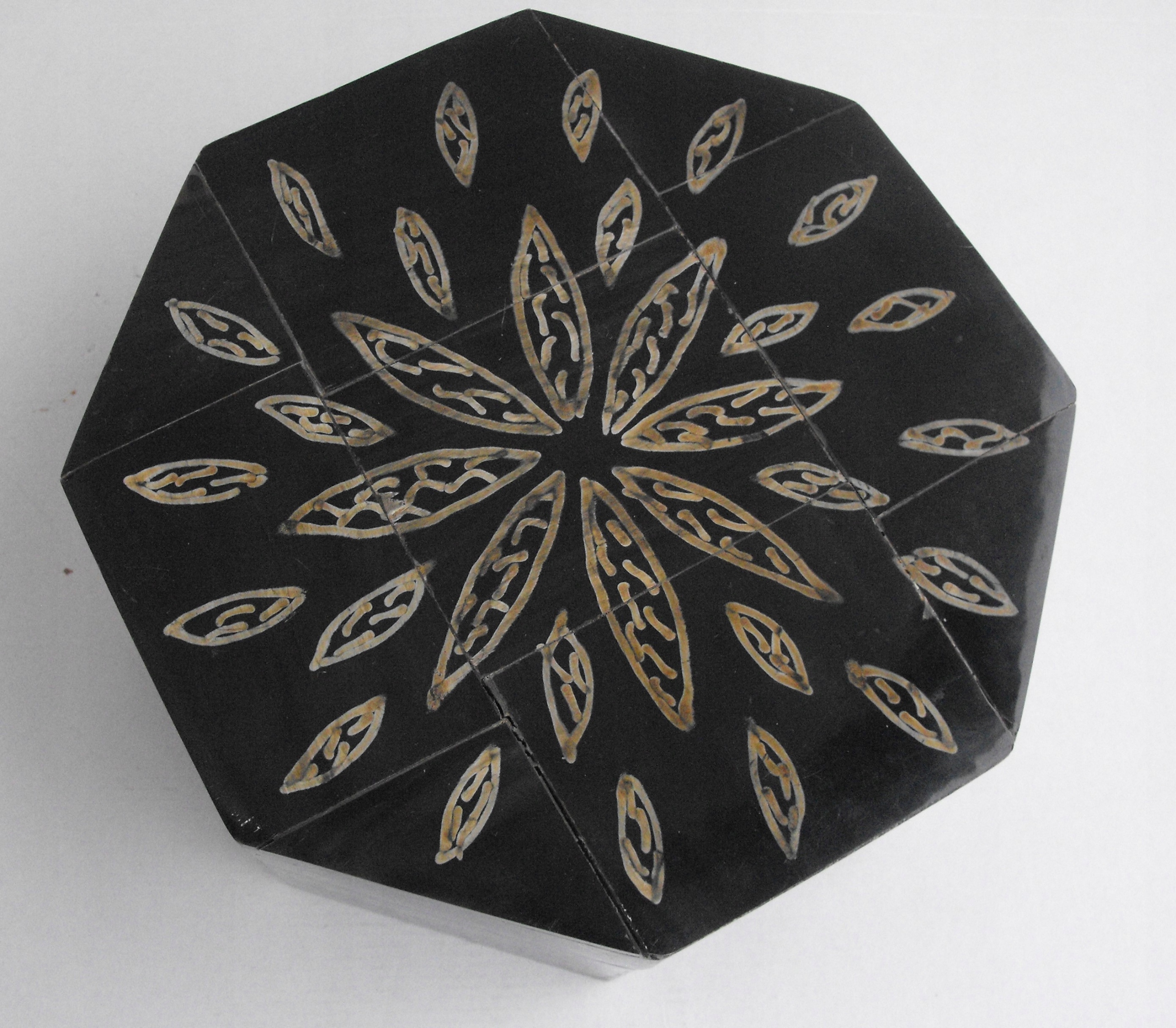Цікава коробка, покрита плитками з чорного обсидіану, декорована вручну, ймовірно, африканська. Розміри прибл. 18 x 18 см, висота прибл. 8 см. Реальні фото пропонованого товару додаються.