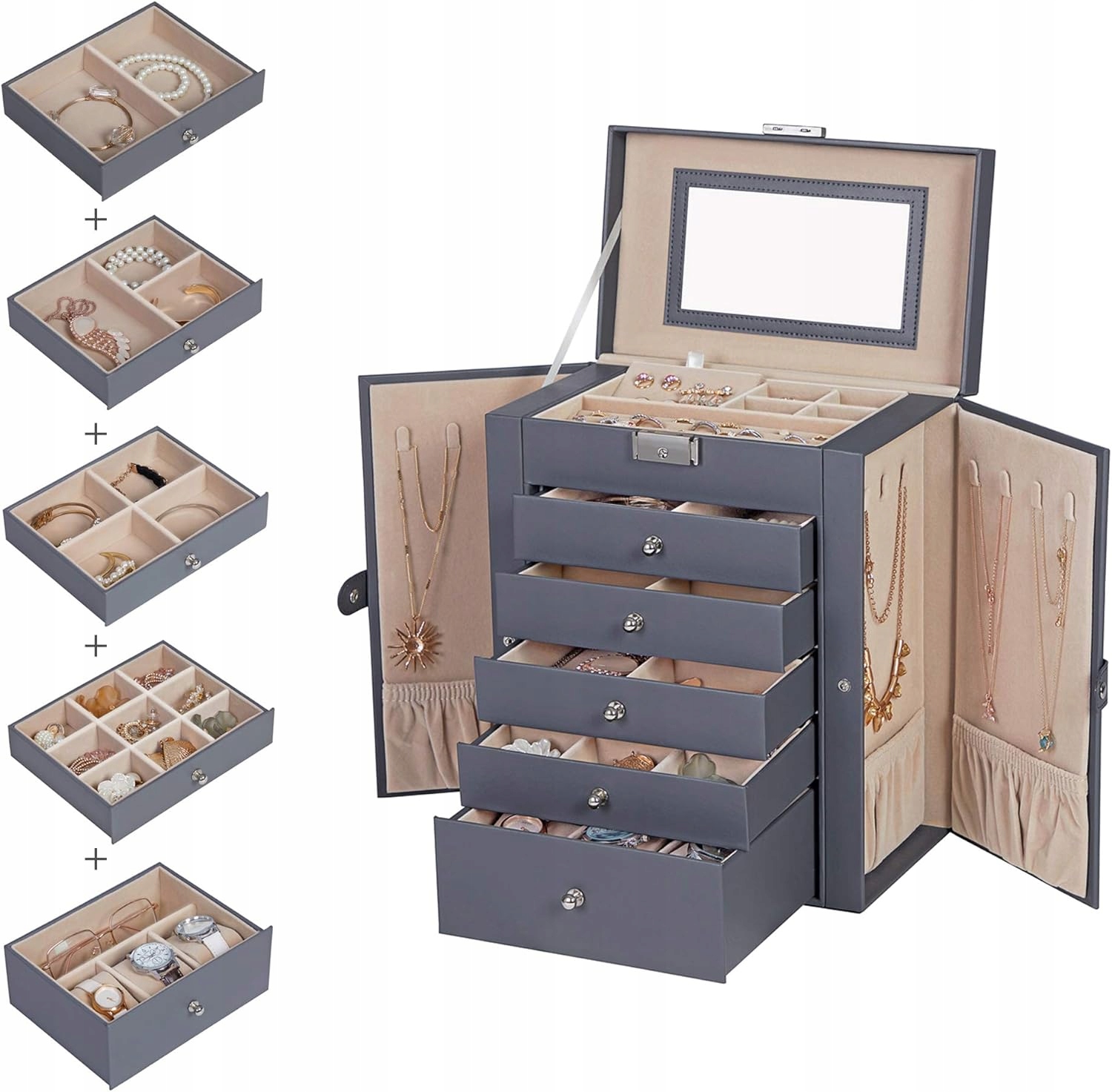 SZKATUŁKA NA BIŻUTERIĘ 6 POZIOMÓW BOCZNE DRZWICZKI SZUFLADY LUSTRO ZAMEK