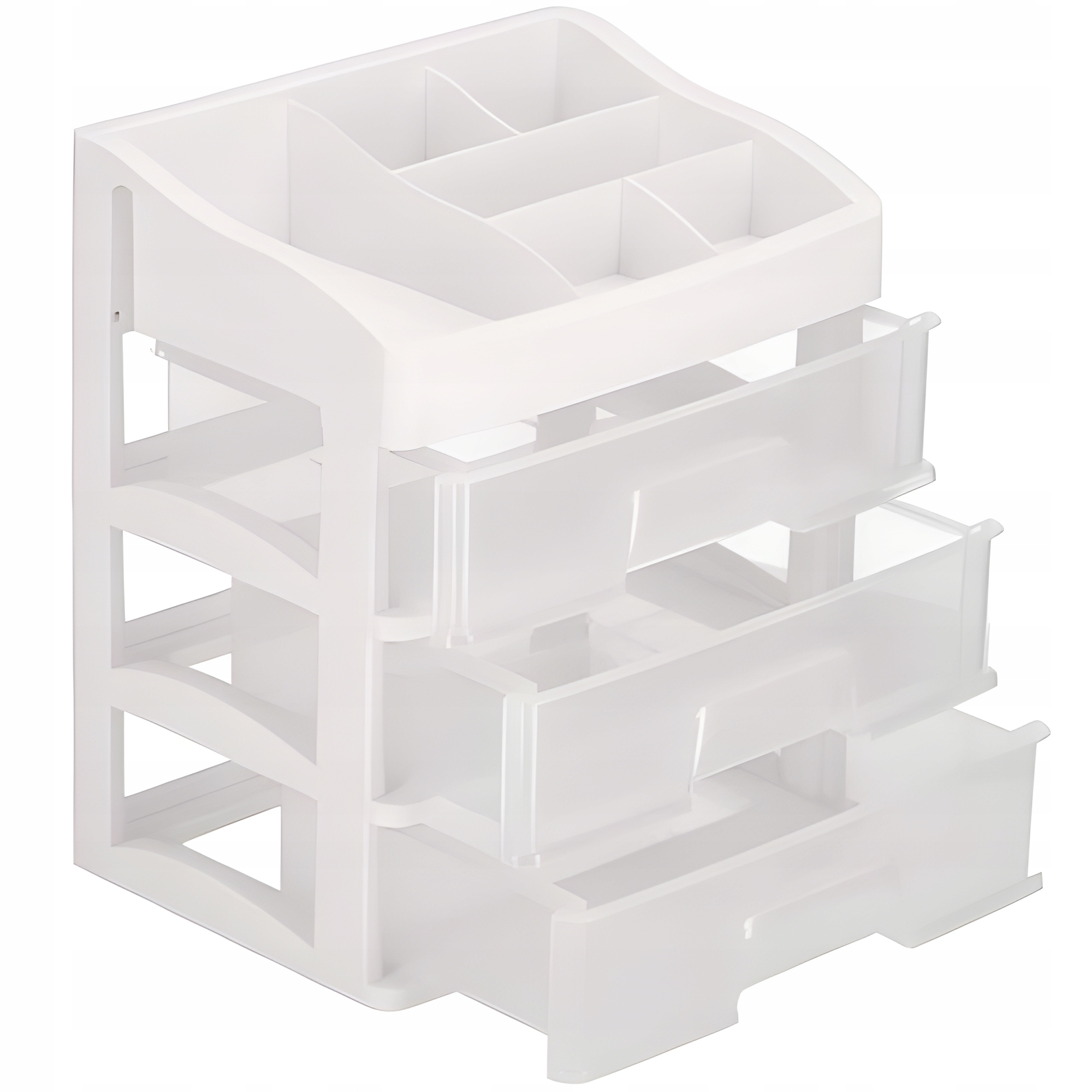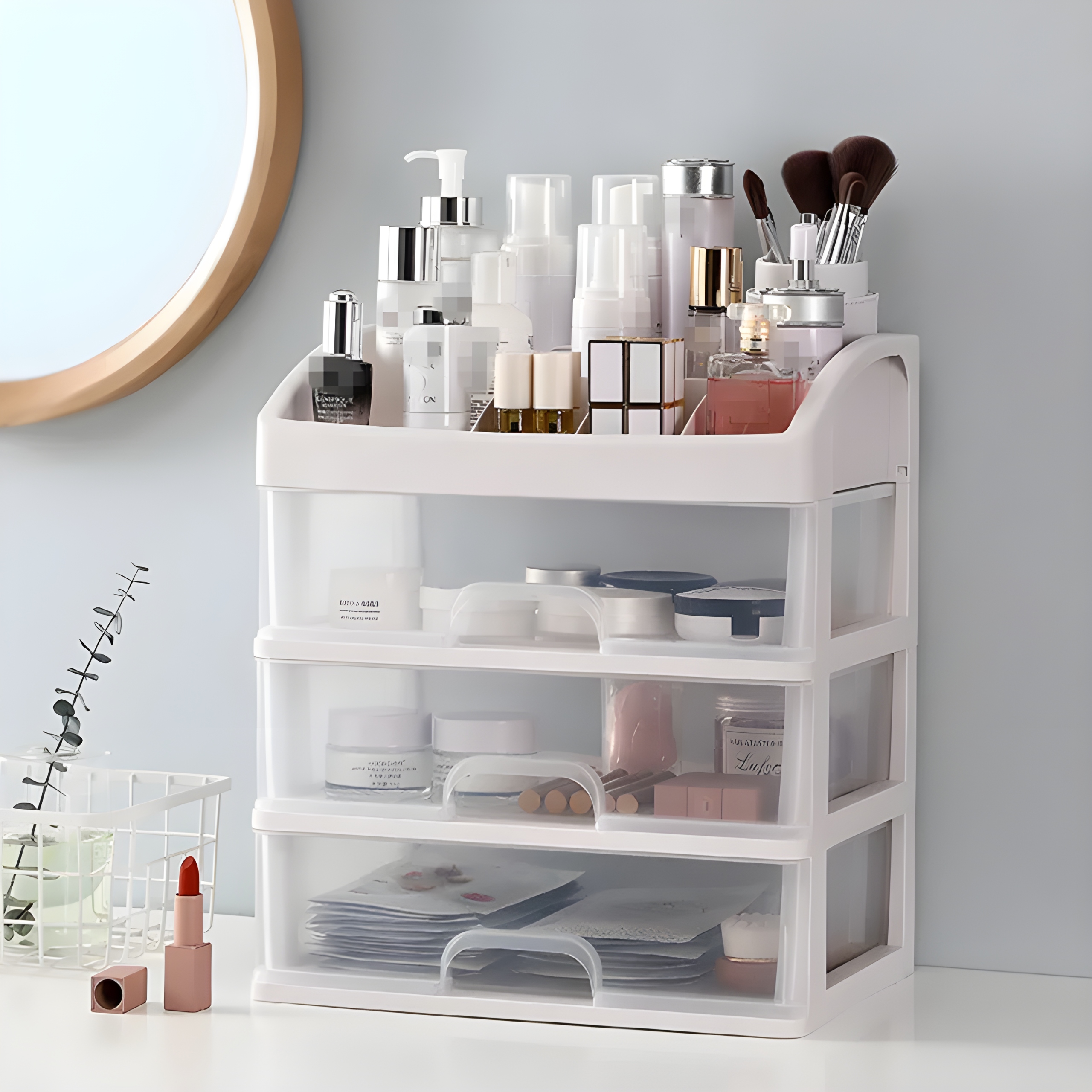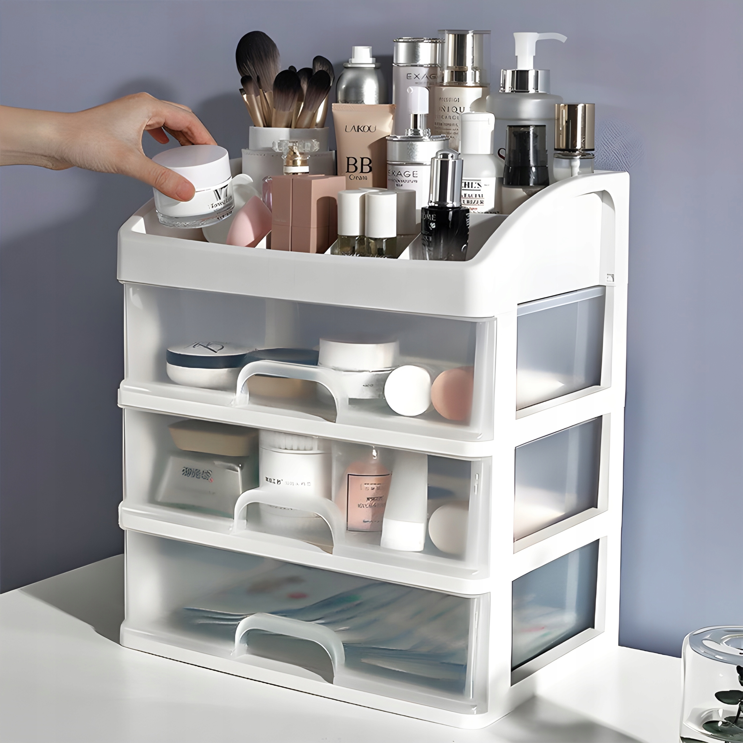 Оснащений трьома місткими висувними ящиками, цей органайзер пропонує достатньо місця для зберігання більших речей, таких як палетки тіней, пудра або набори пензлів.
