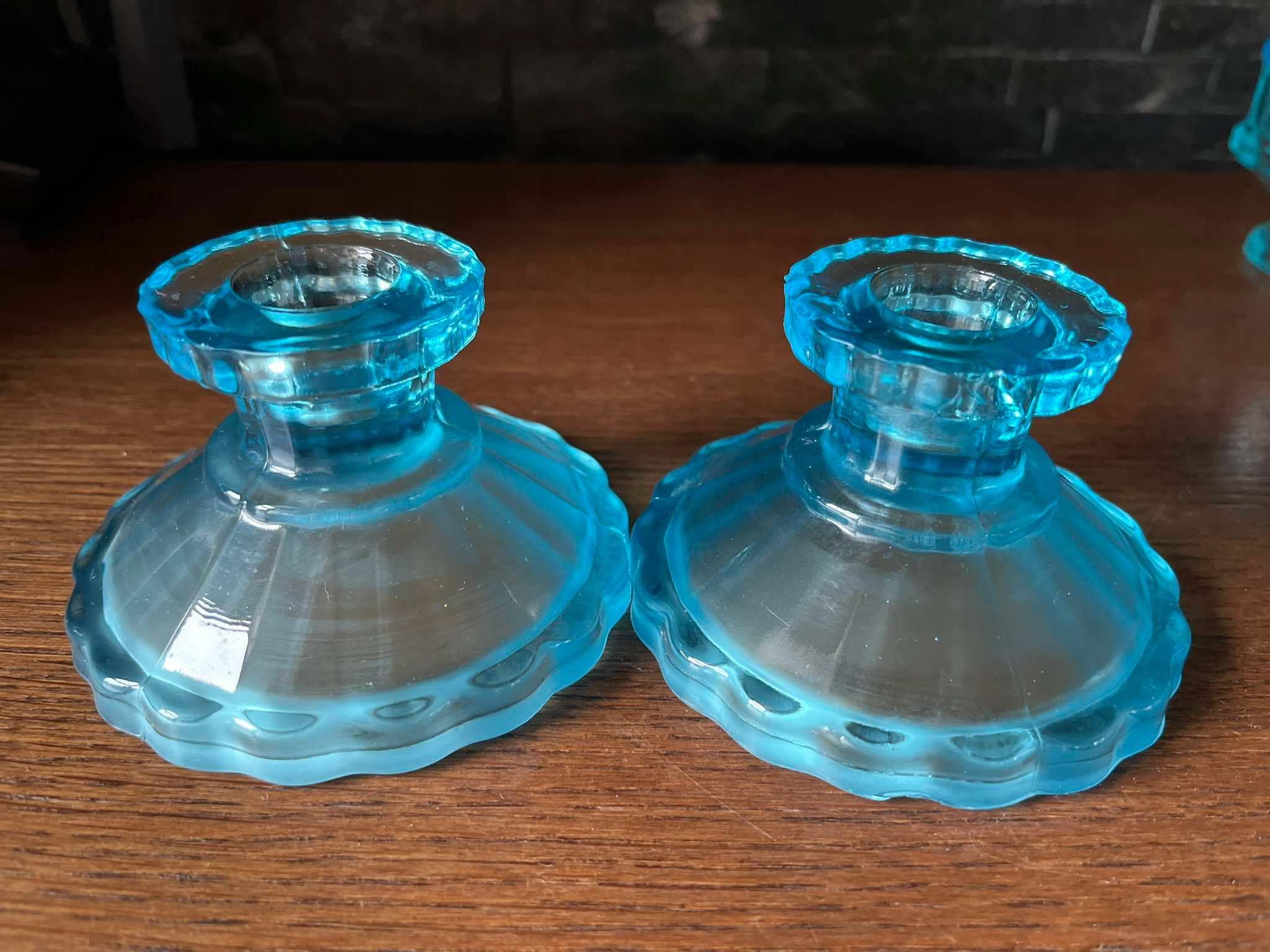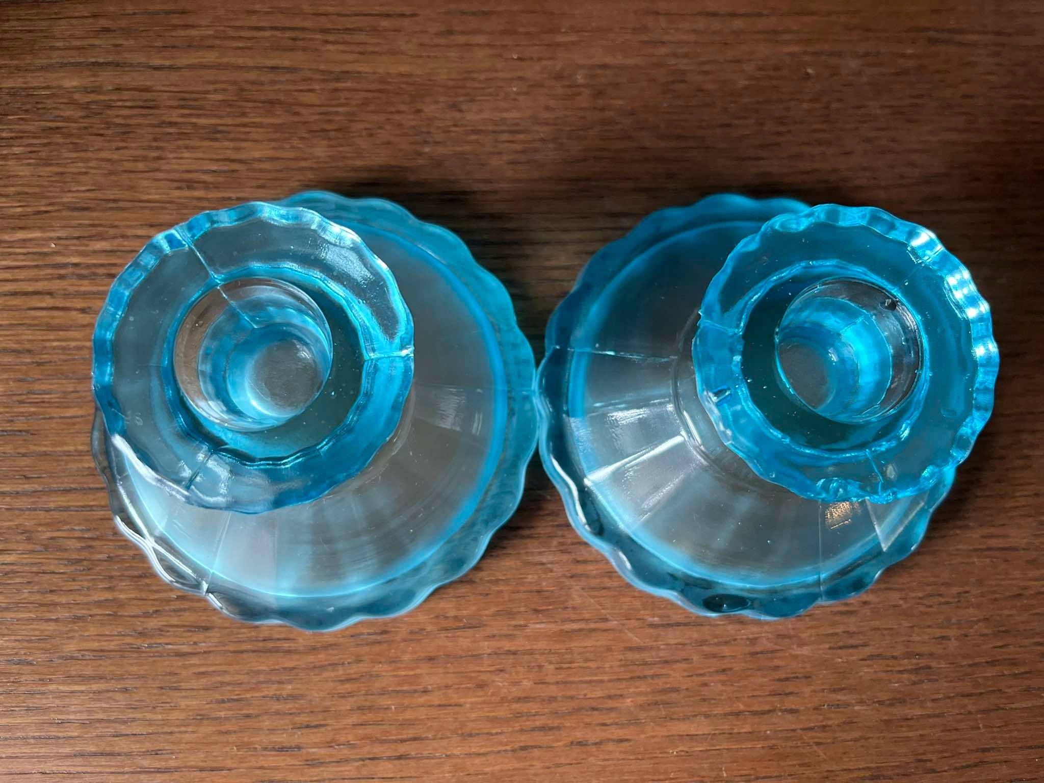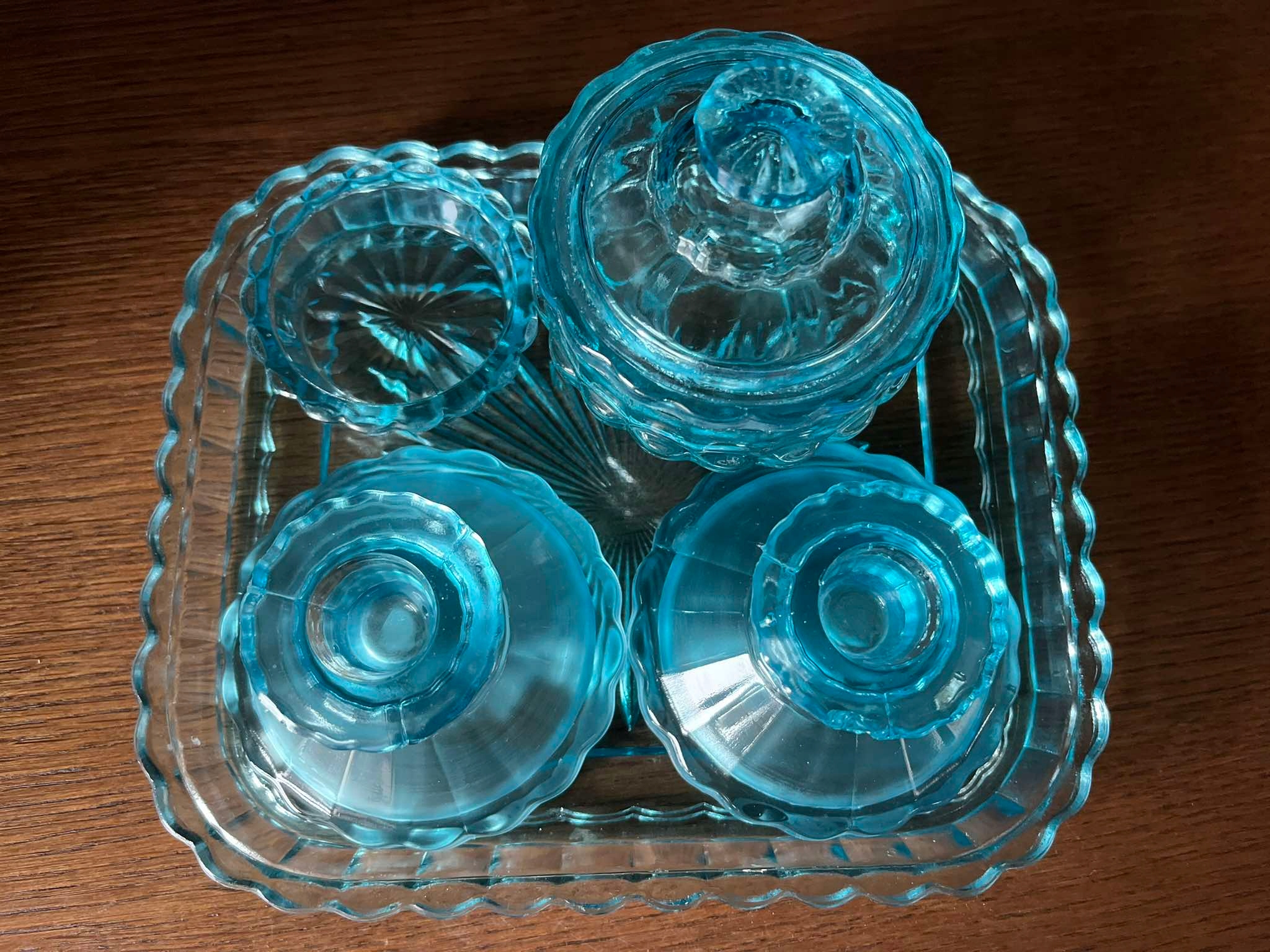 Szklany zestaw na toaletkę stół błękitne szkło vintage