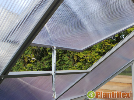 Уздовж двох довших сторін, довжиною 310 см, є дві ринви, завдяки яким можна ефективно відводити дощову воду в одне місце, наприклад, резервуар для дощової води. Стільниковий полікарбонат зберігає на 40% більше тепла всередині теплиці в порівнянні з традиційним матеріалом зі скла, а тому ви подовжуєте вегетаційний період ще на місяць, ніж у випадку зі скляним аналогом. Крім того, камерна структура полікарбонату розсіює сонячне світло, що потрапляє всередину, що запобігає ефекту т.зв. опіки рослин. Це також захищає їх від ультрафіолетового випромінювання.