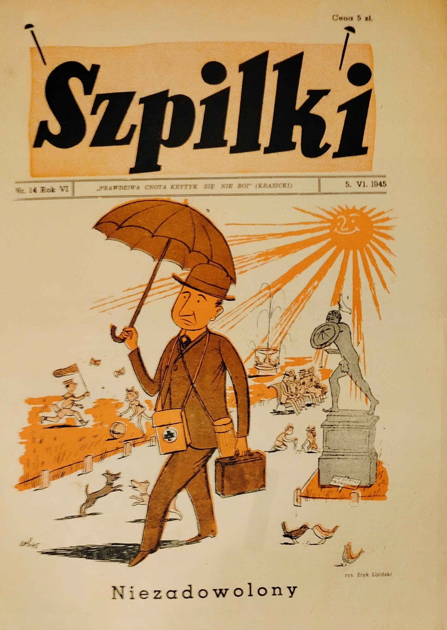 Випуск від 5 червня 1945 р. 8 сторінок, формат 30x42 см, добрий стан [незначна склейка на корінці, кілька сантиметрів склейки на одній зі сторінок] ][ Захист сатири - Анджей Новіцький, сугестивний малюнок Кароля Баранецького - "Новий шлях до нової краси" - німці робили мило з людей, У пеклі - Юзеф Яскловський, Де Гітлер - Казімеж Ґрус, Св. Й. Лец - Патетичні епіграми, В Італії Муссоліні - Альдо Міколай, на розвороті є велика композиція Єжи Заруби під назвою Łapanka, Pieśń o wazelina - Janusz Minkiewicz, "RENA" - Paweł Hertz, Jan Rojewski, Розмовники - Stefania Grodzieńska, Кабінет курйозів, два малюнки - Ha-ga, Епіграми: Teodor Bujnicki - ілюстрації - Ignacy Wtz ][ ГУМОР ] [ ДРУГА СВІТОВА ВІЙНА ][ 1945 ]1310D