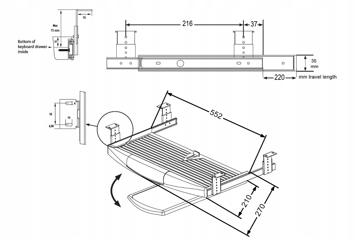 Полиця висувається на суцільну металеву напрямну довжиною 350 мм. Направляюча має регульовану висоту кріплення полиці, а стопор запобігає зсуву клавіатури. Крім того, в шухляді є пенал, що дозволяє зберігати дрібні офісні речі. Ця модель також оснащена висувним килимком для миші.