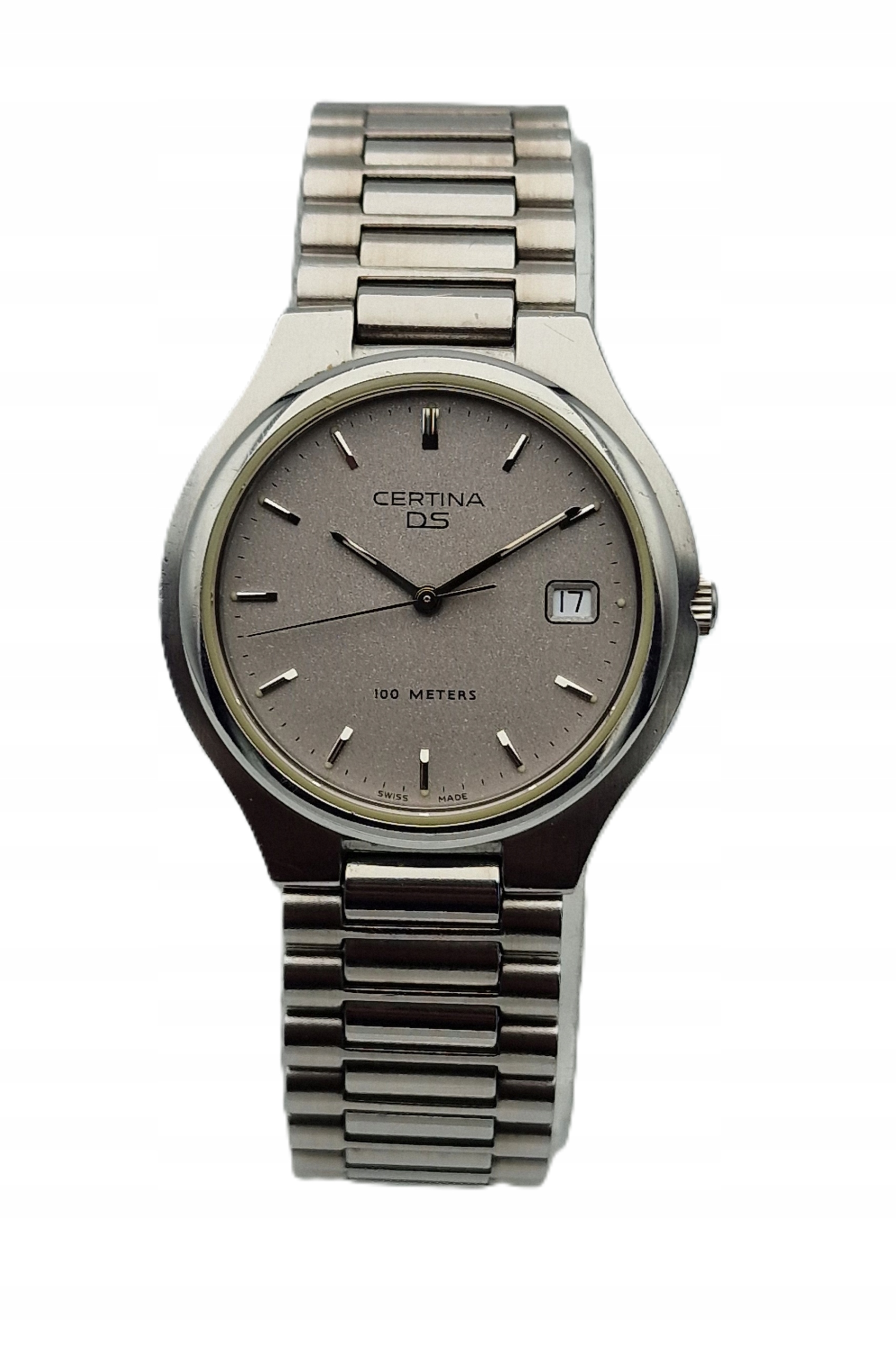 - Сріблястий металевий циферблат із відображенням дати на третій годині. Оригінальний циферблат із підписом: «CERTINA DS, 100 МЕТРОВ, ВИРОБНИЦТВО В Швейцарії». Циферблат в ідеальному стані, видно на фото.