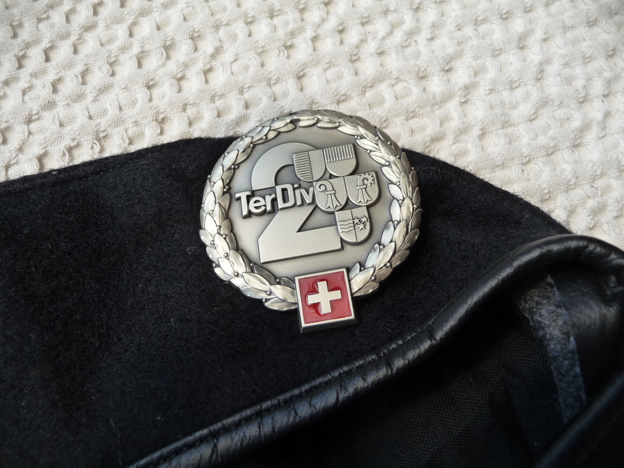 SZWAJCARSKI WOJSKOWY CZARNY BERET SZYTY R.58 Z ODZNAKĄ EMBLEMATEM