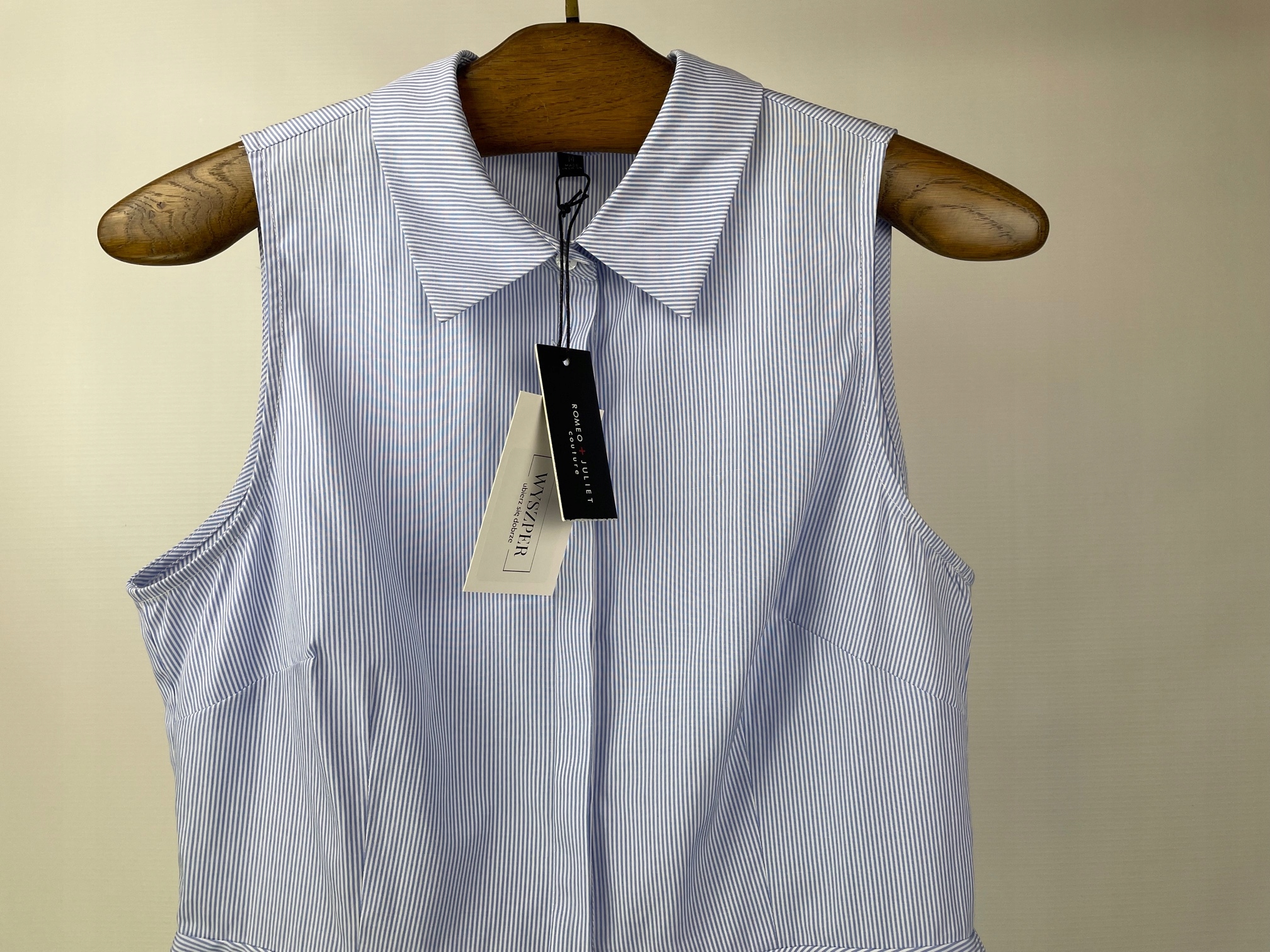 - Ромео+сорочка Juliet Couture. Це без рукавів білими та сині кольори у візерунку тонких, вертикальних смуг. Блуза з коміром, кріпленим прихованими кнопками. Внизу у неї чарівний басейн. Це було дуже якісно вшиті. Це буде красиво з штанами, і спідницею.
