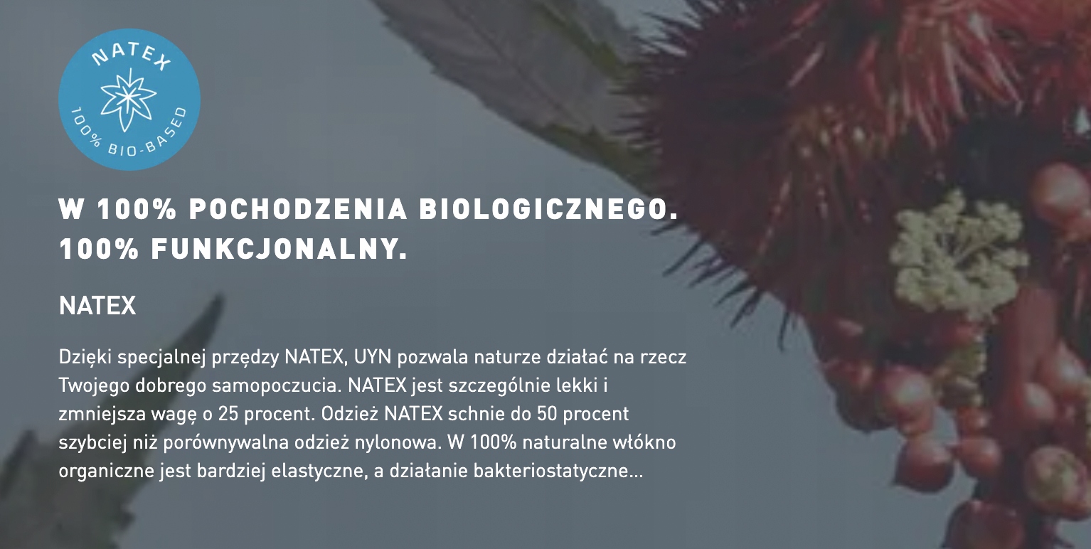 Завдяки Uyn, спортсмен стає одного з природою. Спеціальні волокна природно гармонійно поєднують "природу" всередині одягу з природою на вулиці та забезпечують повну свободу та легкість. Одяг Uyn забезпечує нові враження завдяки інтелектуальній пряжі та інтегровані, безшовні методи. Адаптується до руху, добре дотримується шкіри і створює ідеальну атмосферу тіла для змагальних видів спорту.