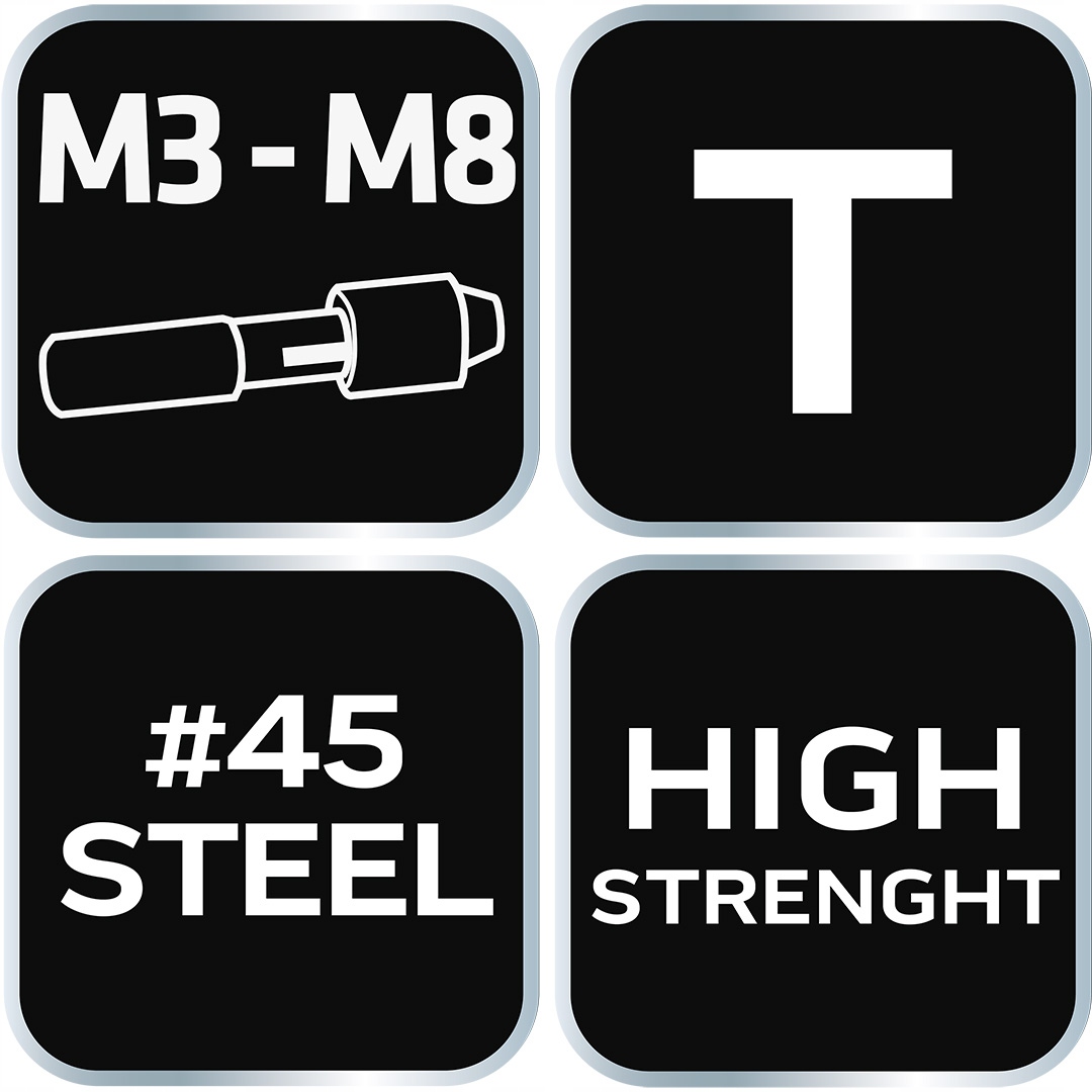 Ручка типу "Т" з тріскачкою для мітчиків M3 - M8, сталь 12-908 NEO - це інструмент, запропонований для зручної роботи з мітчиками. Сумісний з елементами розміром від M3 до M8 NEO. Універсальна ручка дозволяє заощадити простір і час, необхідний для пошуку виробу з однаковим призначенням, але різними параметрами Виготовлена зі сталі 45#, завдяки чому не деформується і забезпечує міцну опору Ручка марки NEO рекомендована для майстерні застосування, в роботі механіків і слюсарів.