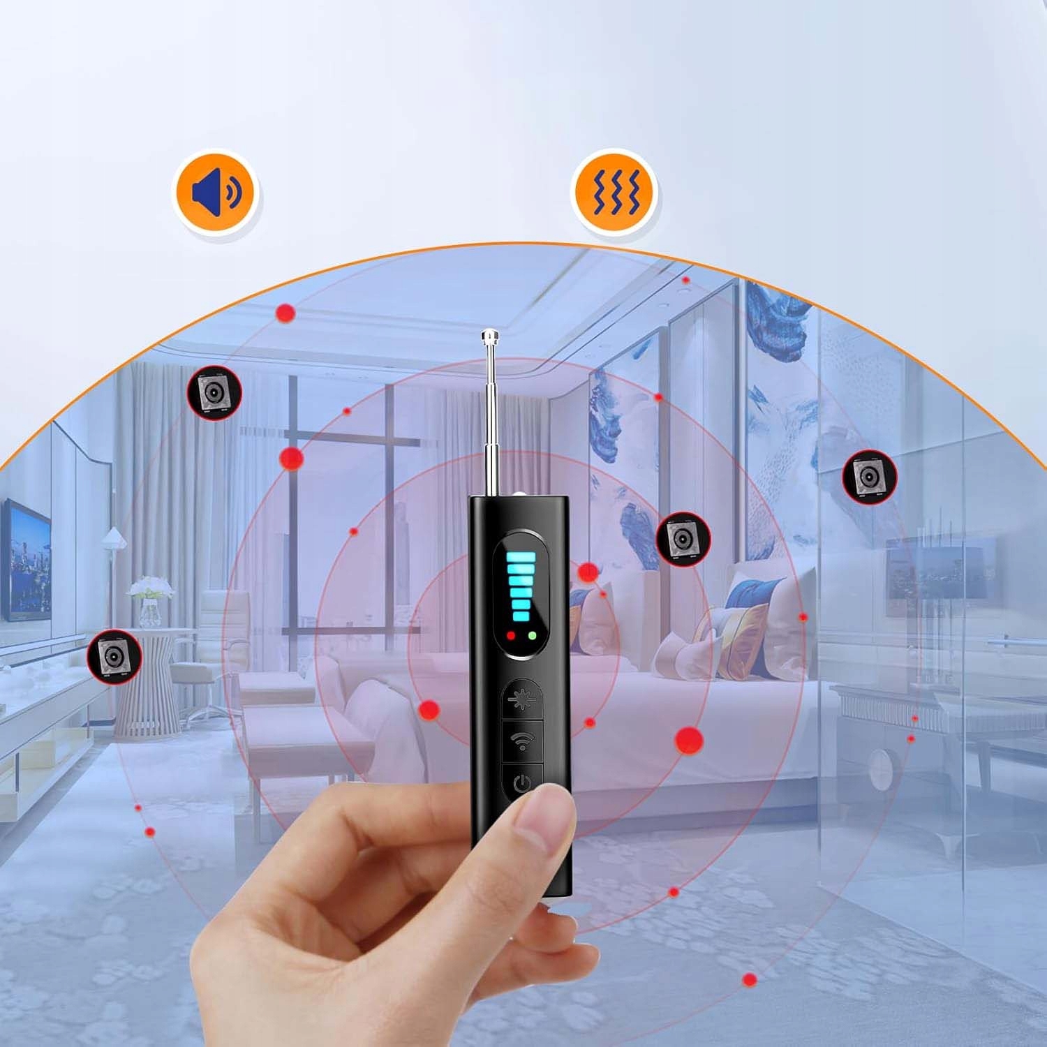 ✨✨Надчутливе регулювання: використання вдосконалених високочутливих мікросхем дозволяє точно визначати джерела сигналу. Пристрій пропонує 5 рівнів чутливості та ефективно виявляє в радіусі до 30 м².
