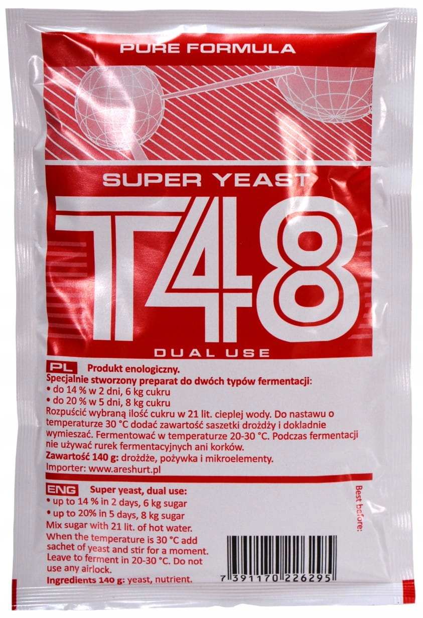 Сильніша версія добре відомих дріжджів T3, які використовуються роками. Це суміш активних спиртових дріжджів, поживних речовин, вітамінів і мікроелементів, призначена для швидкого зброджування цукрових сумішей. Дріжджова суміш Т48 дуже швидко освітлюється, а сильні штами, що входять до складу упаковки, дозволять отримати опару міцністю до 20%. Однак при короткому 48-годинному бродінні можна отримати брагу з вмістом 14% спирту. В упаковці вже містяться вітаміни, мінерали та поживні речовини, тому немає необхідності використовувати додаткові поживні речовини.