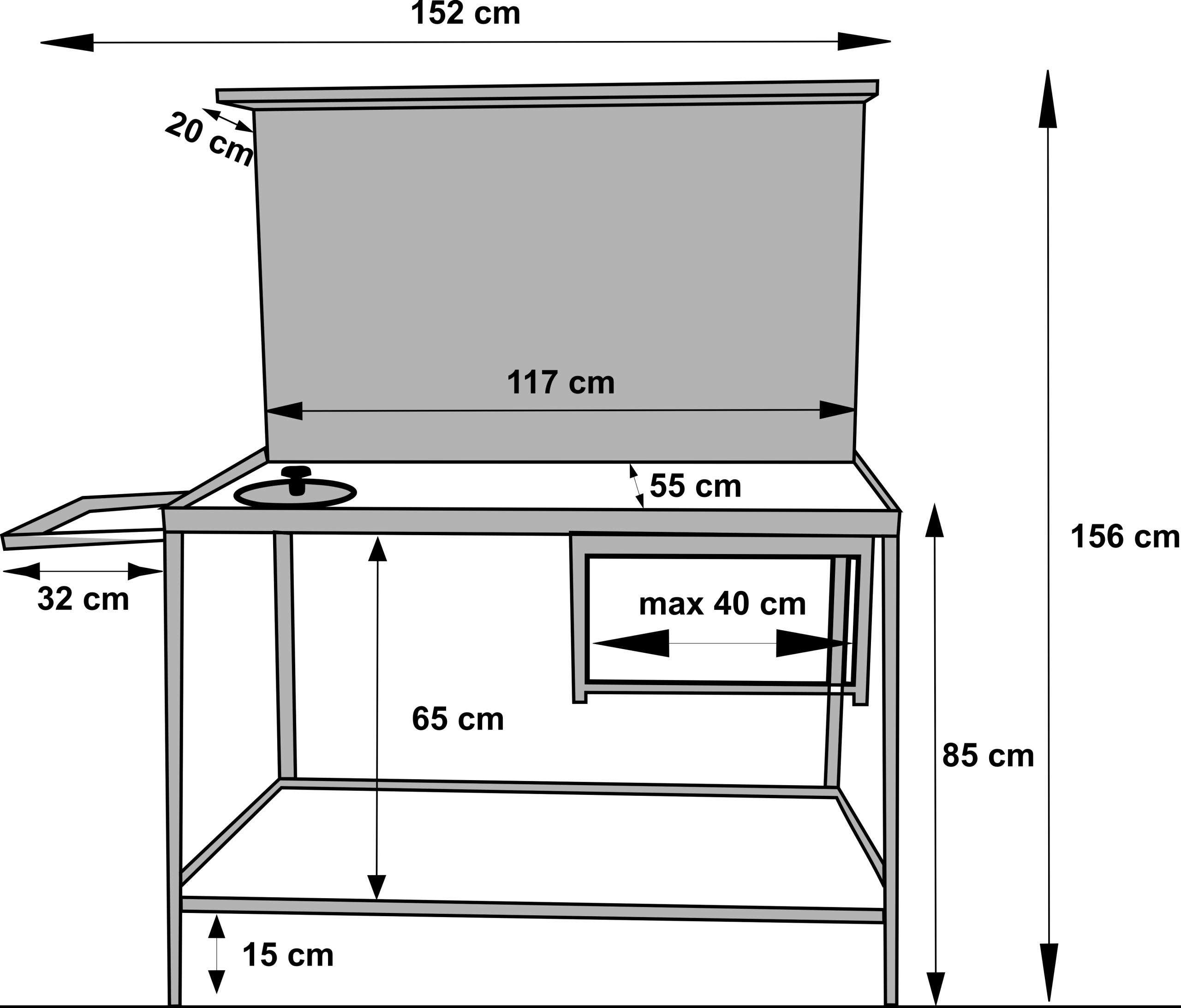 Робоча поверхня розміром 117x55 см: це основна частина столу, де відбувається процес підготовки лаку. Ця поверхня виготовлена з нержавіючої сталі, міцного та гладкого матеріалу, який дозволяє легко очистити весь бруд. Піднятий край запобігає витіканню хімікатів за межі дренажної чаші.