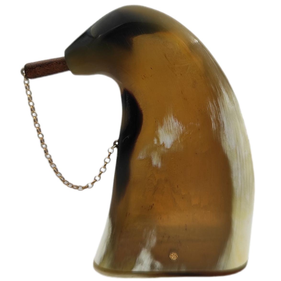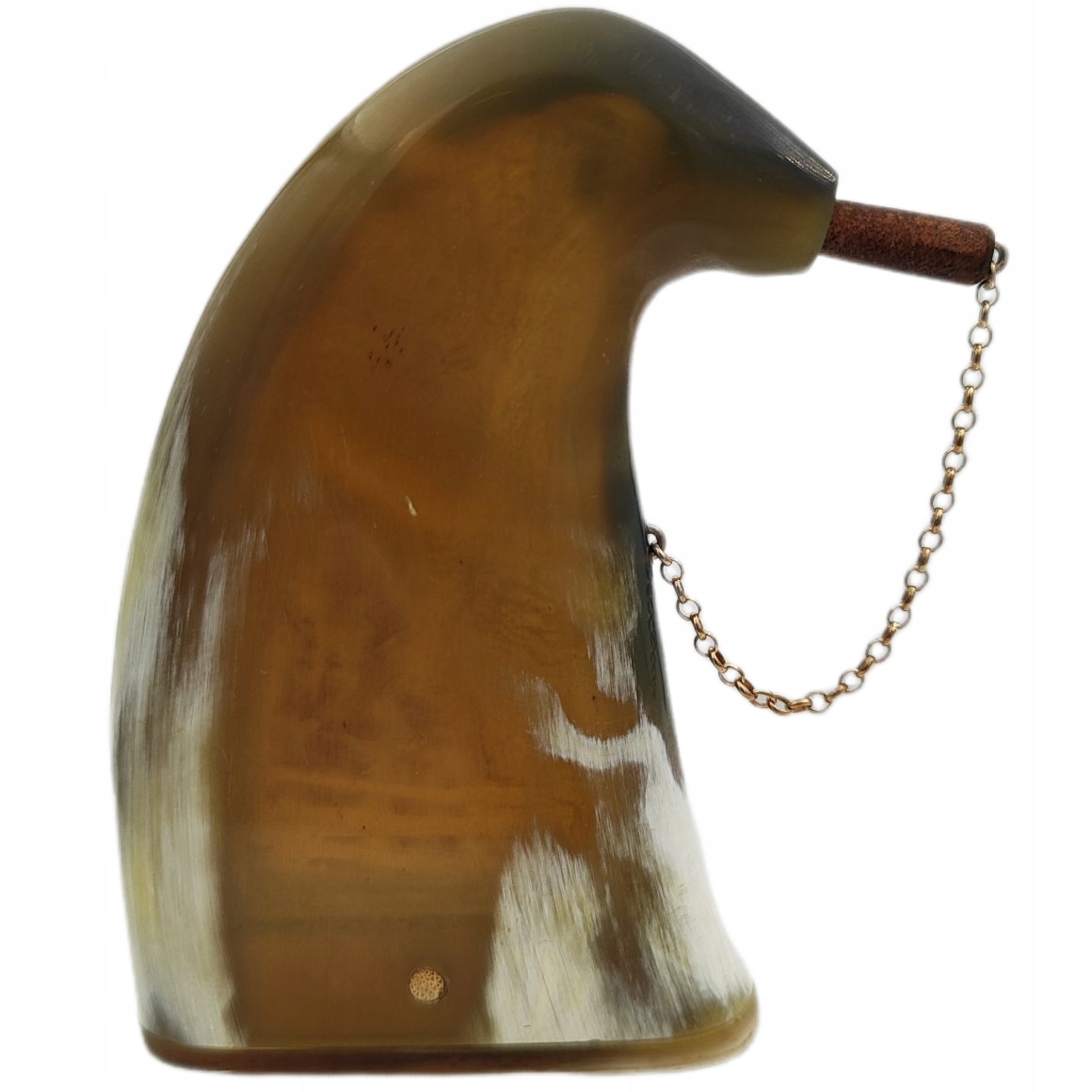 Дно табакерки також зроблено з рогу.Щоб відкрити його, виштовхніть дерев'яну пробку, розташовану на бік. Вилка зі шкіри, підвішена на металевому ланцюжку.