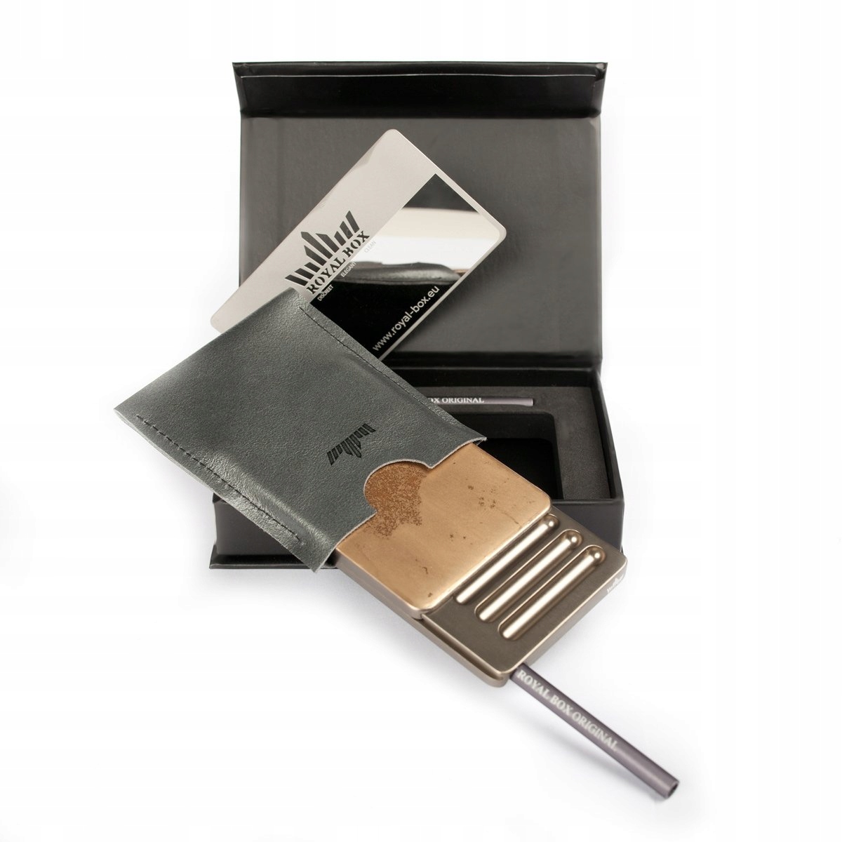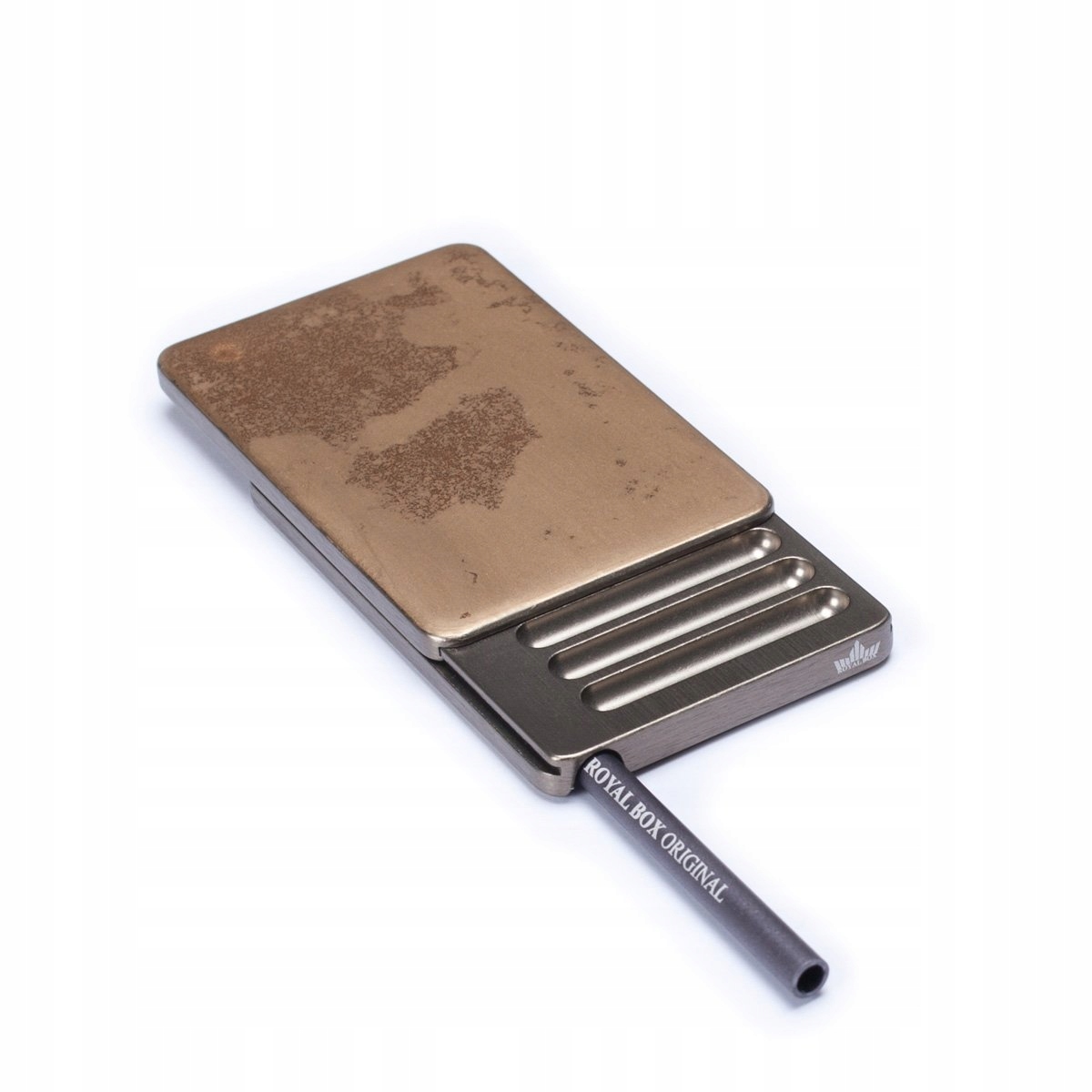 Виготовлений із матового алюмінію з покриттям Old Gold. Royal Box — це унікальна табакерка для нюхальних табакерок/порошків, розміром із платіжну картку.