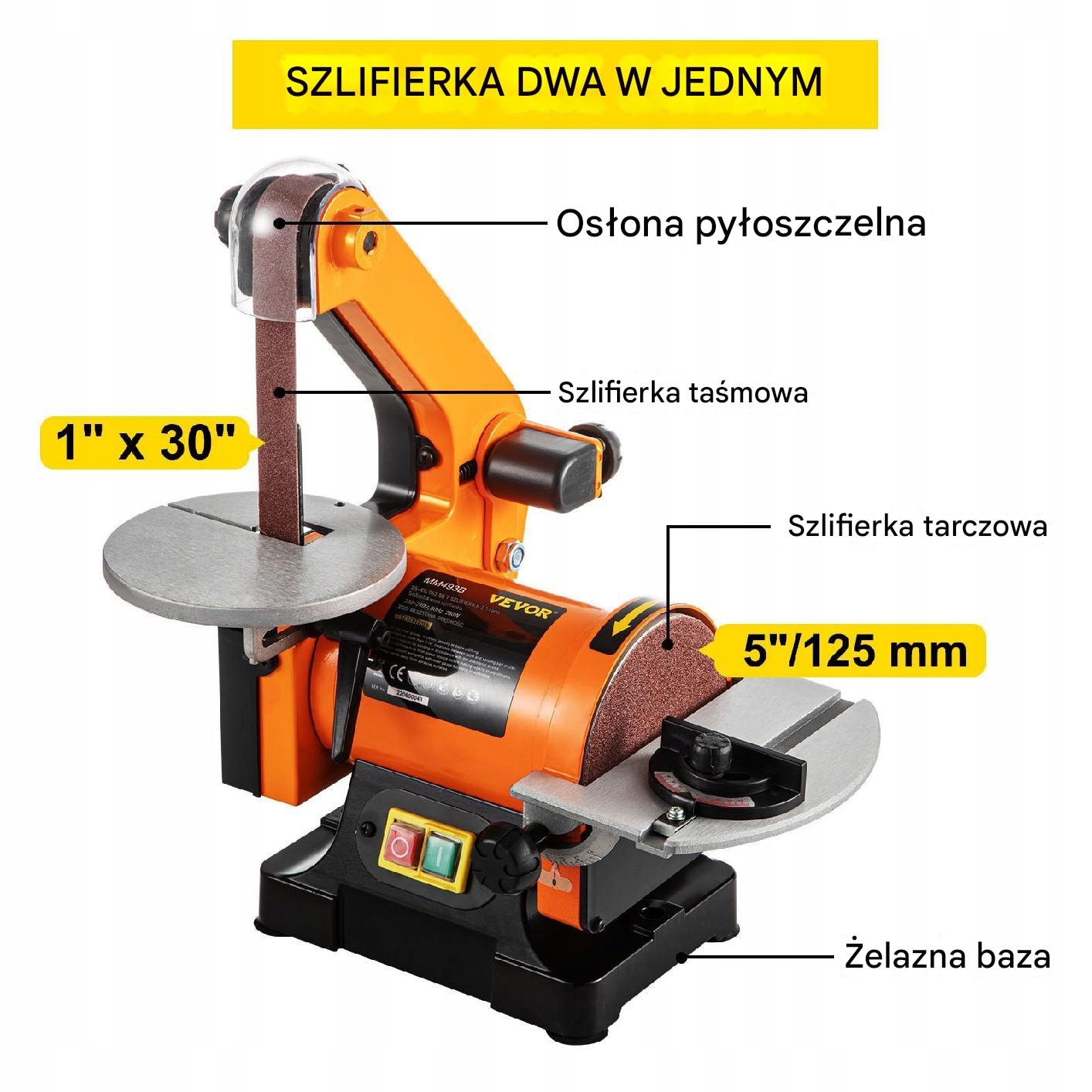 живлення : 250 Вт Блок живлення : 230 В/50 Гц Розмір ременя : 25,4 x 762 мм розмір щита : 125 мм табл. : 0 ° -45 ° Швидкість стрічки : 13,5 м/с Швидкість щита : 2980 об/хв/хв Діаметр отворів для видалення пилу : 45 мм