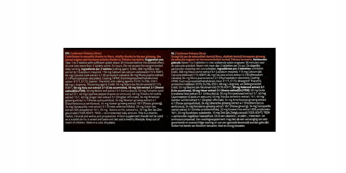 - Наповнювач: E460, 268 мг екстракту кореня маки 6:1, 116 мг кальцію, 84 мг екстракту кори катуаби 4:1, 84 мг екстракту муіра пуама 2:1, покриття: гідроксипропілметилцелюлоза, барвник: E171, E172, Носій: триацетин, антизлежувачі: E570, E470b, E551, 68 мг L-аргініну, загущувач: E468, 50 мг ніацину, 50 мг екстракту горіха коли 2:1, 50 мг екстракту вівса 2:1 Глютен, 50 мг екстракт кропиви дводомної 5:1, 40 мг пекучого перцю, 40 мг екстракту Tribulus Terrestris 13:1, 40 мг екстракту кореня імбиру 5:1, 34 мг екстракту кореня женьшеню сибірського 4:1, 34 мг корейського женьшеню екстракт 18:1, 34 мг екстракту кореня американського женьшеню 4:1, 34 мг екстракту кореня сарсапарілли 5:1, 20 мг екстракту зеленого чаю 50% поліфенолів 10:1, 20 мг екстракту яловичини, 10 мг цинку.