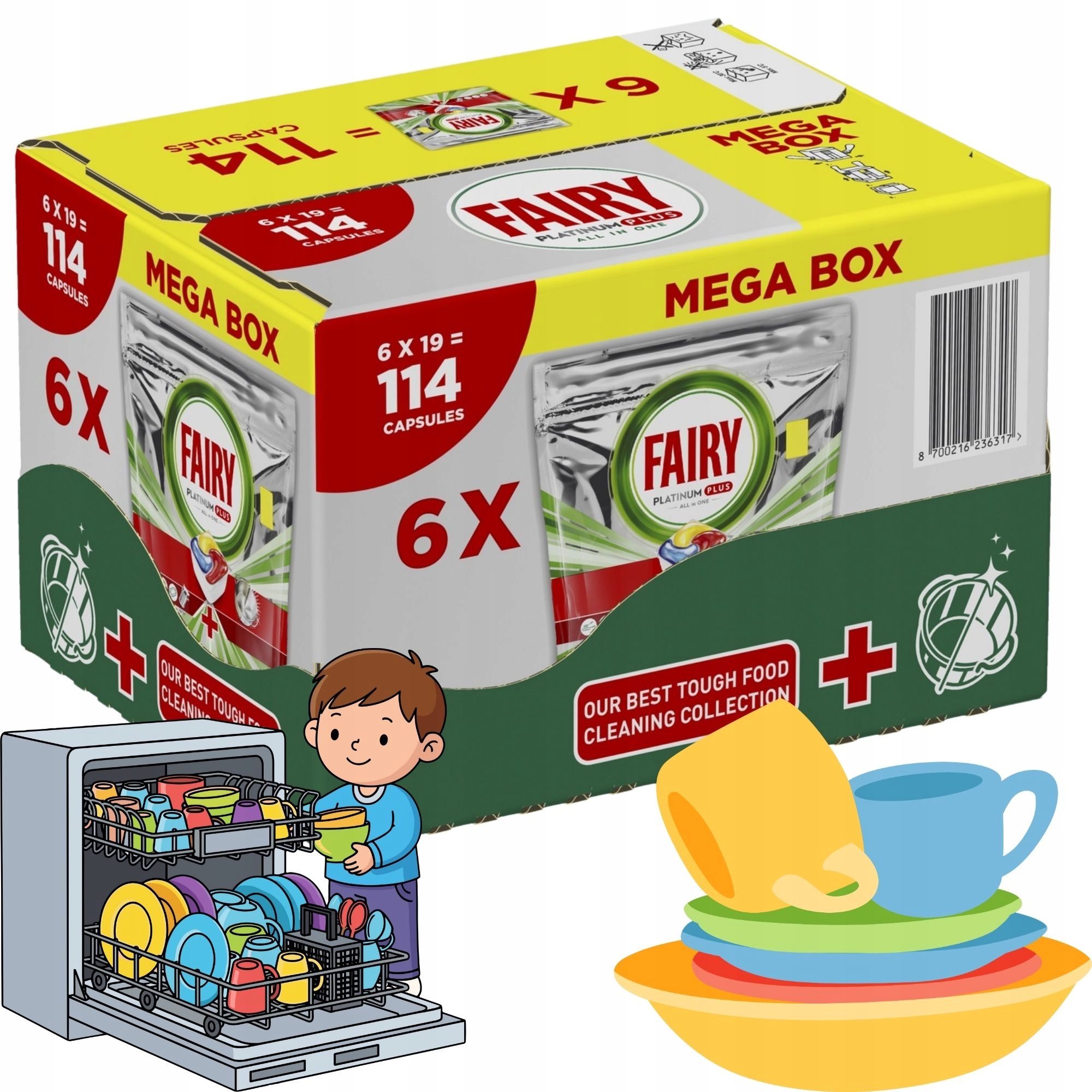 Капсули для посудомийної машини FAIRY Platinum Plus Lemon A114 – BOX 6×A19 — це максимальна потужність прання у зручному збірному наборі 🔥✨. Вдосконалена формула Platinum Plus легко справляється з жиром, пригорами та засохлими залишками їжі - без попереднього ополіскування 🍽️💪.