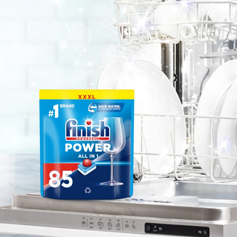 Finish Power All in 1 — багатофункціональні таблетки для миття посуду. Ефективно усуває жирні забруднення та видаляє відкладення кави та чаю. Крім того, вони захищають фільтри та скло посудомийної машини та запобігають утворенню вапняного нальоту. Завдяки потужності Powerball вони також видаляють пригорілі залишки їжі та надають посуду сліпучого блиску без розводів.