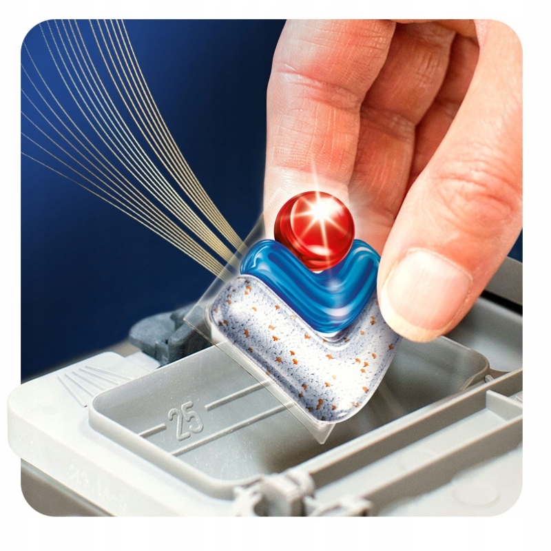 Ці три- камерні капсули ефективно видаляють усі типи залишків після їжі, не потребуючи попереднього ополіскування посуду. З якими б труднощами не постала кухня, ці капсули справляються з нею ідеально. Крім того, вони захищають скло від корозії та запобігають утворенню вапняного нальоту в посудомийній машині.