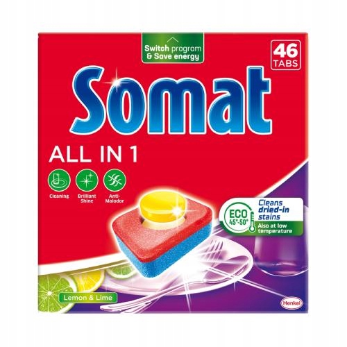 Таблетки Somat All in 1 забезпечують ідеально чистий посуд, видаляють засохлі залишки їжі - також при низьких температурах екопрограми та короткому митті цикли! Отримайте ефект ідеально чистого та блискучого посуду без жодних зусиль завдяки таблеткам Somat All in 1!