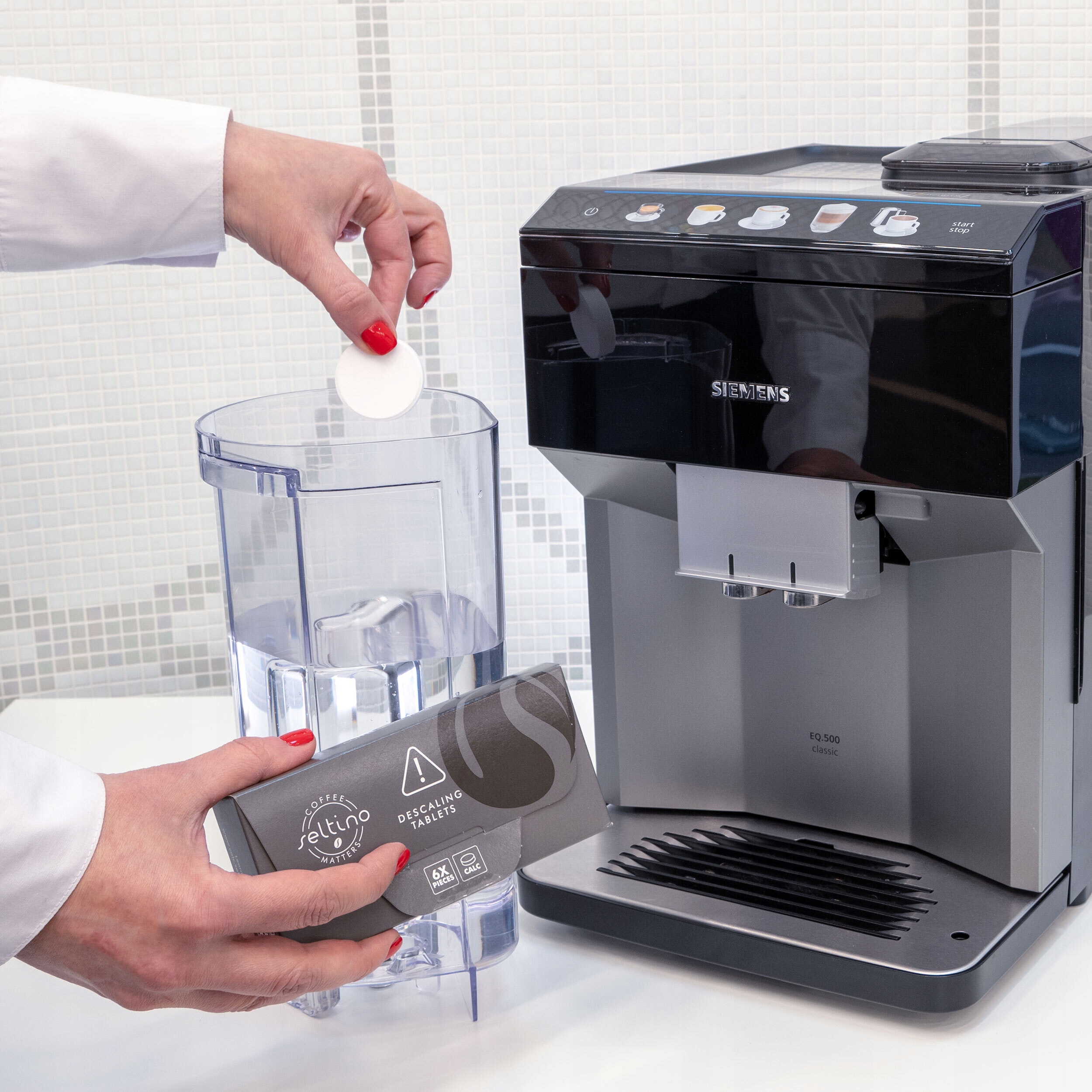 Регулярне видалення накипу допомагає підтримувати ваш пристрій у відмінному стані. Таблетки для видалення накипу не мають миючих властивостей. Для отримання ідеального смаку кави також рекомендується використовувати таблетки для очищення Seltino Clean.
