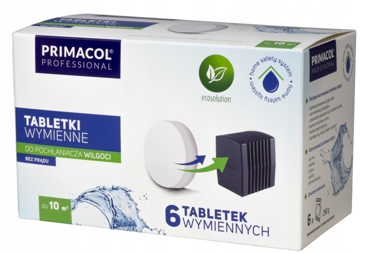 Упаковка 6 таблеток кожні 250 г. 4 Це знижує вологість до 55-60%, а потім підтримує оптимальну вологість повітря, без висихання. поглинач вологи Primacol не використовує електроенергію і містить контейнер для запобігання розчину і рекомендується для страждаючих на алергію. Одна таблетка є достатньою залежно від температури та вологості, навіть протягом 1-2 місяців у приміщеннях з площею до 10м2. Він захищає від неприємного запаху, пропарюючи вікна, цвілі та гриби.
