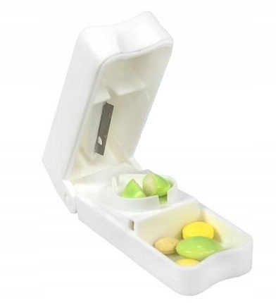 Планшетник дозволяє легко розрізати таблетки на рівні частини. Куттер вміщує таблетки будь-якого розміру. Він виготовлений з міцного матеріалу. Він також має контейнер для наступних доз. Особливо корисно для людей із фізичними труднощами та літніх людей