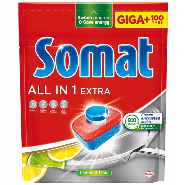 - Сильний очисний ефект: Таблетки Somat All in 1 Extra для миття посуду видаляють навіть найсильніші опіки, залишаючи кожен ідеально чистий і блискучий посуд разом.