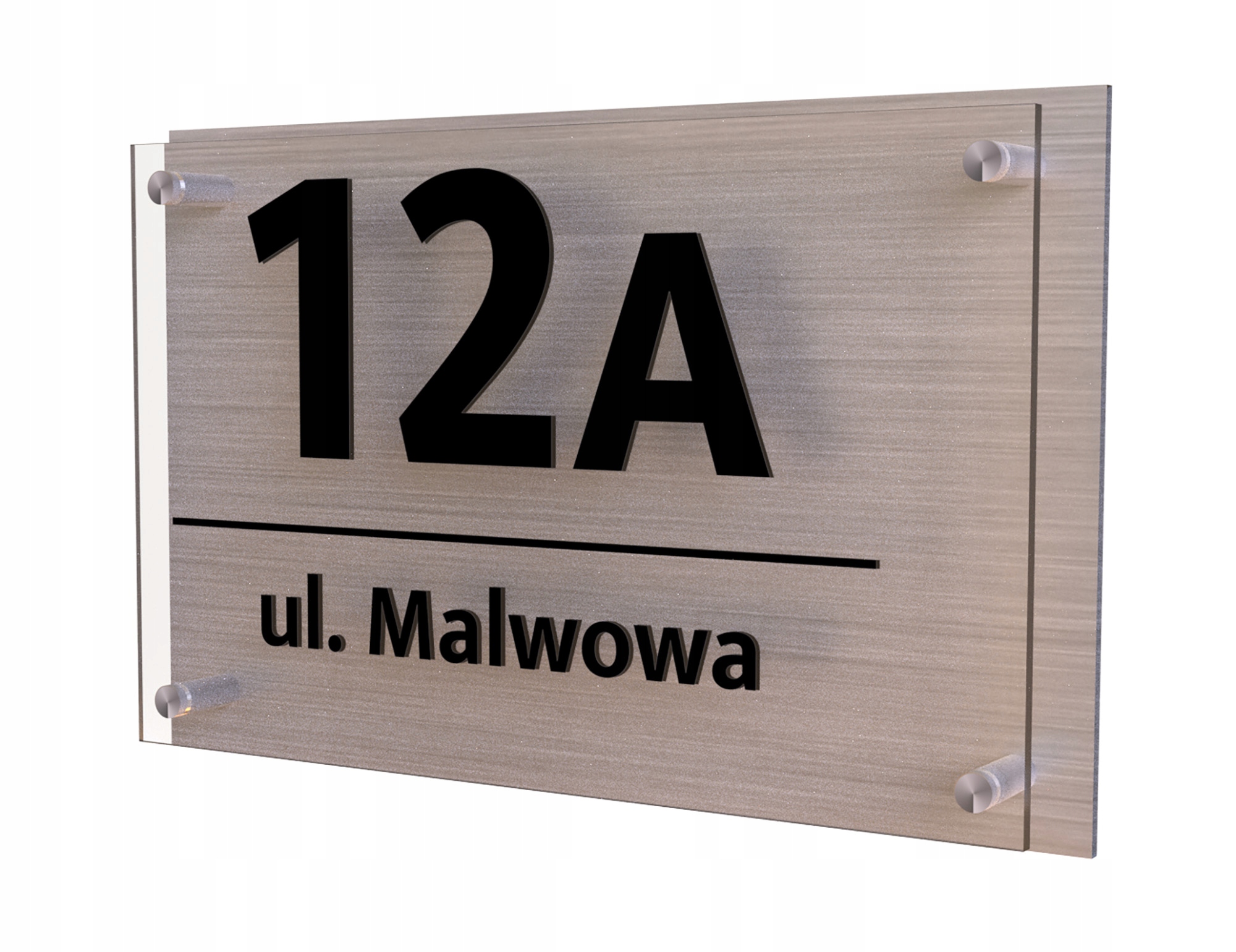 Ексклюзивна адресна табличка з безбарвного оргскла. 3 мм і прямий УФ-друк на прокладках на шліфованій сріблясто-дибондовій основі (або іншій на вибір) – надзвичайно елегантне рішення, яке використовується при нумерації будинків і квартир. Міцний матеріал і високоякісна технологія друку дозволяють естетичну та виразну ідентифікацію.
