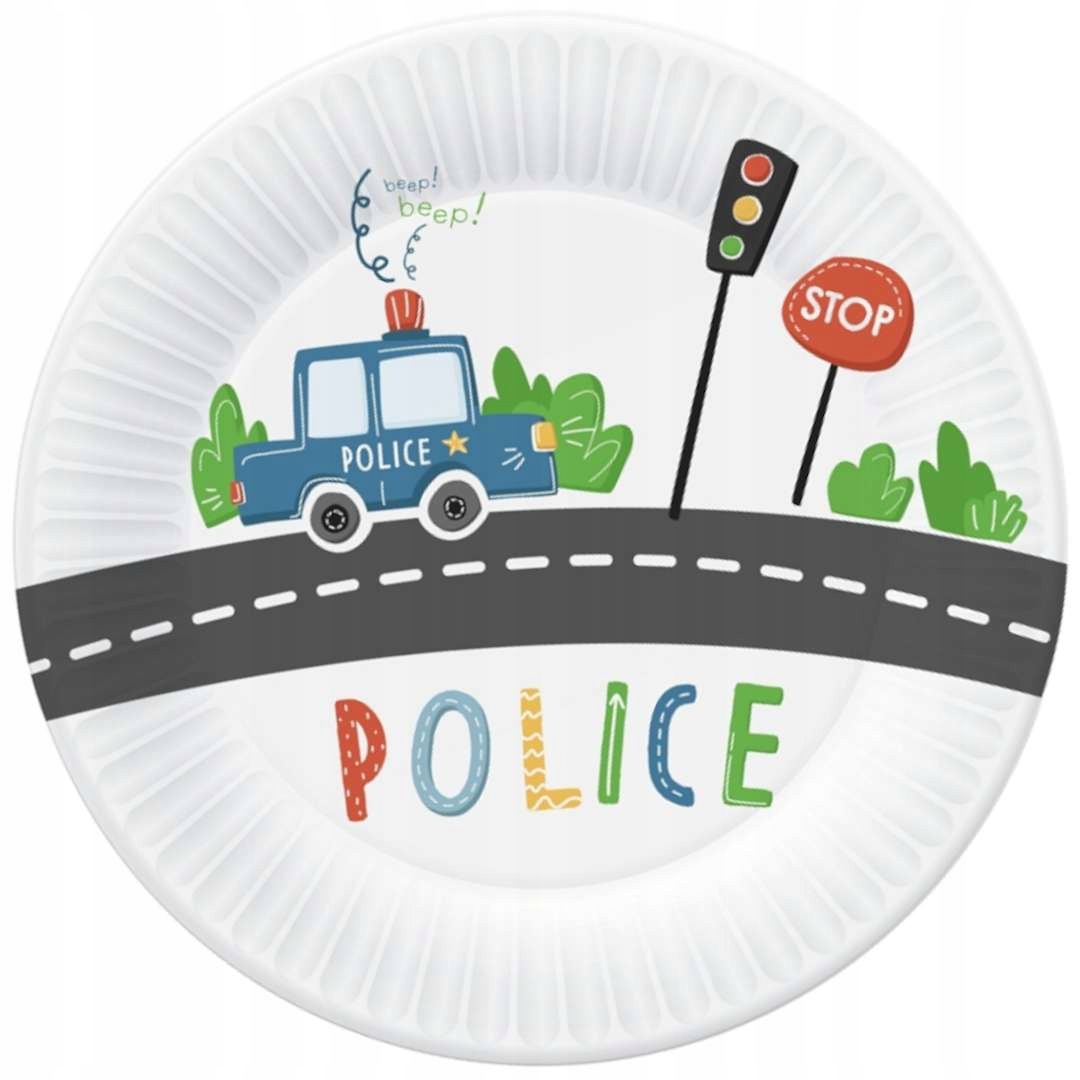 Набір кольорових паперових тарілок із написом «Поліція». На них є принт із мультяшним блакитним поліцейським автомобілем, що ковзає по дорозі з сиреною. Тарілки чудово прикрасять стіл на святкуванні дня народження вашої дитини. Особливо, коли ваш малюк у майбутньому хоче стати поліцейським. Погляд на такі тарілки неодмінно викличе посмішку на його обличчі та запалить до веселощів. Крім того, тарілки будуть чудовими, якщо ви не хочете мити посуд після вечірки, просто зім’яйте їх і утилізуйте.