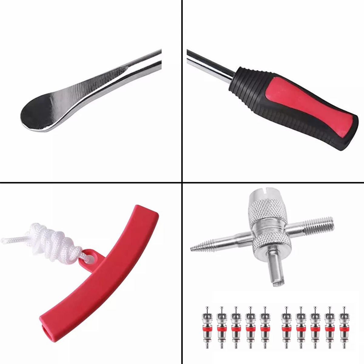 Кругла і плоска ложка легше поставити в шину, щоб підірвати його. Ложка велосипедів, анти -слиз, гумова ручка, з не -слизною ручкою, структура, що не має слизу. Ергономічна безпечна ручка ложки мотоциклів зручна і може використовуватися протягом тривалого часу. Практична ложка шин, яка не стискає внутрішні трубки та захищає шини. Обкладинка обода ефективно захищає ободок від подряпин та подряпин. Поперечний ключ із вставкою та ковпачком для клапана полегшує заміну деталей при заміні шин