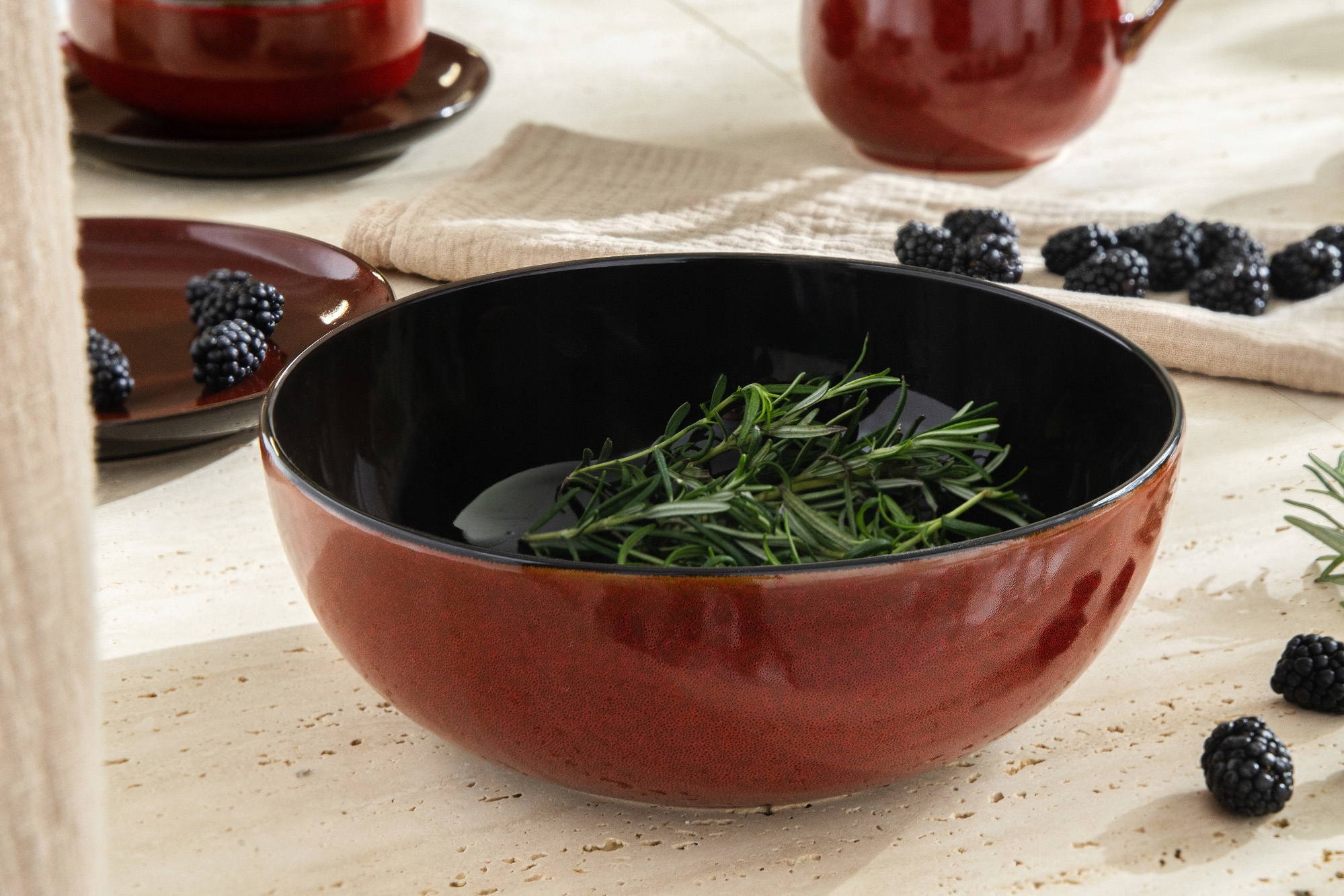 Завдяки поєднанню теплих, червоних -бровних поверхонь з контрастними, кави -бровними акцентами, ця послуга випромінює з глибиною та персонажем, додаючи унікальний стиль до кожного прийому їжі. Крім того, всі елементи адаптовані для миття посудомийної машини, що забезпечує зручність повсякденного використання.