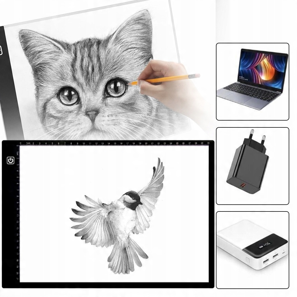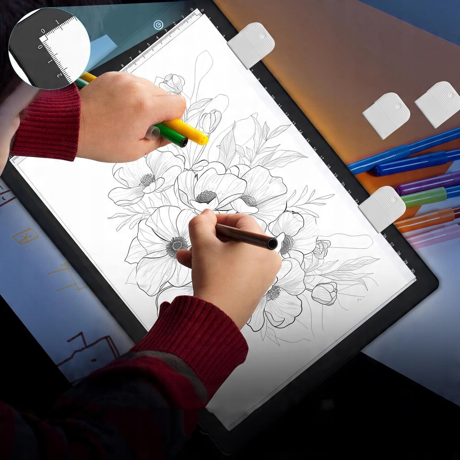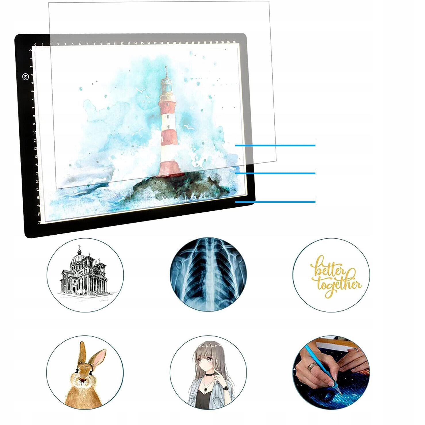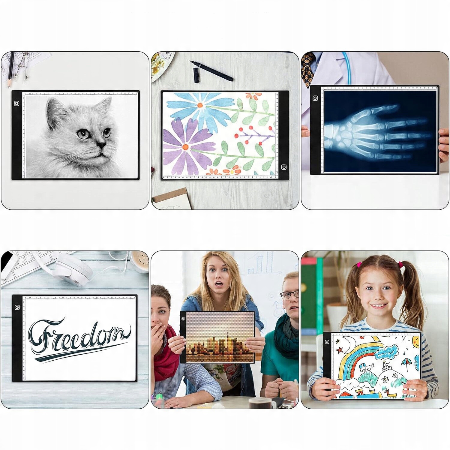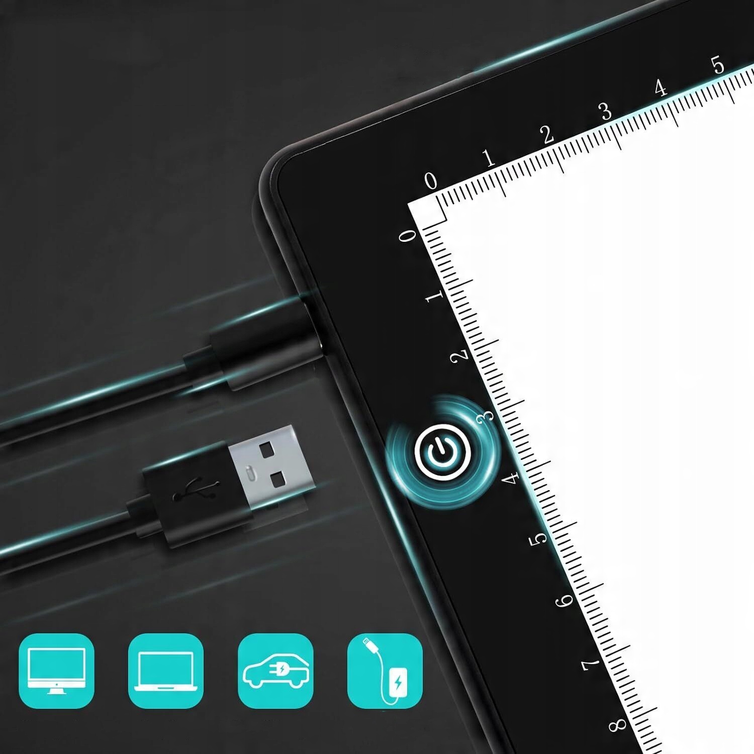 🖼 【з правителем направлення та кабелем USB】: Таблиця світлодіодного освітлення також має лінії, прикріплені горизонтально та вертикально для легкого та точного вимірювання. Покладка світлодіодного освітлення A4 має 1,5-метровий USB-кабель, який дозволяє підключати будь-який пристрій, наприклад Портативне джерело живлення, ноутбук тощо. USB -кабель з довжиною 1,5 метра може задовольнити потребу в зарядці на великій відстані. а також аматори, завдяки якому у вас є можливість створити діамантові зображення з родиною чи друзями, малюванням, ескізом, дизайном та дизайном моди тощо